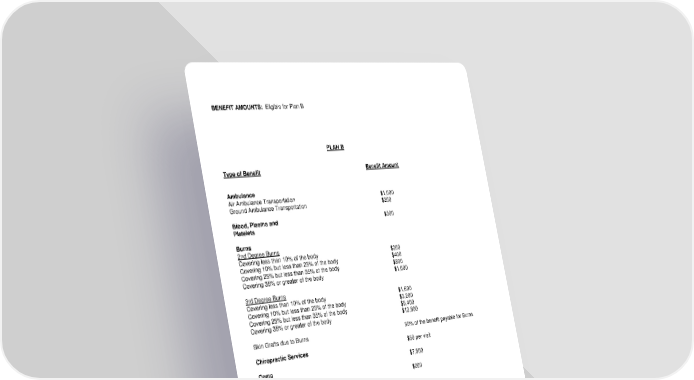 BENEFIT AMOUNTS: Eligible for Plan B PLAN B Type of Benefit Benefit Amount Ambulance Air Ambulance Transportation $1,000 Ground Ambulance Transportation $200 Blood, Plasma and $300 Platelets Burns 2nd Degree Burns Covering less than 10% of the body $200 Covering 10% but less than 25% of the body $400 Covering 25% but less than 35% of the body $800 Covering 35% or greater of the body $1,600 3rd Degree Burns Covering less than 10% of the body $1,600 Covering 10% but less than 25% of the body $3,200 Covering 25% but less than 35% of the body $6,400 Covering 35% or greater of the body $12,800 Skin Grafts due to Burns 50% of the benefit payable for Burns Chiropractic Services $50 per visit Coma $7,500 Concussion $200 Dental Injury Extraction $100 Crown $300 Diagnostic Examination $200 LRS-9548-0318-IN Page 1.1