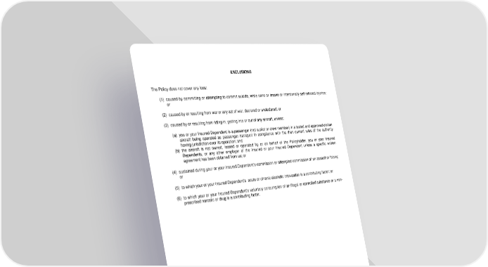 EXCLUSIONS The Policy does not cover any loss: (1) caused by committing or attempting to commit suicide, while sane or insane or intentionally self-inflicted injuries; or (2) caused by or resulting from war or any act of war, declared or undeclared; or (3) caused by or resulting from riding in, getting into or out of any aircraft, unless: (a) you or your Insured Dependent is a passenger (not a pilot or crew member) in a tested and approved civilian aircraft being operated as passenger transport in compliance with the then current rules of the authority having jurisdiction over its operation; and (b) the aircraft is not owned, leased or operated by or on behalf of the Policyholder, you or your Insured Dependents, or any other employer of the Insured or your Insured Dependent unless a specific written agreement has been obtained from us; or (4) sustained during your or your Insured Dependent's commission or attempted commission of an assault or felony; or (5) to which your or your Insured Dependent's acute or chronic alcoholic intoxication is a contributing factor; or (6) to which your or your Insured Dependent's voluntary consumption of an illegal or controlled substance or a non- prescribed narcotic or drug is a contributing factor. LRS-9548-0318-IN Page 13.0