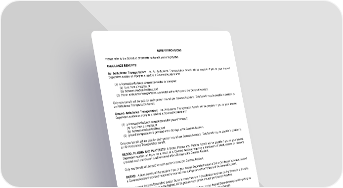 BENEFIT PROVISIONS Please refer to the Schedule of Benefits for benefit amounts payable. AMBULANCE BENEFITS: Air Ambulance Transportation: An Air Ambulance Transportation benefit will be payable if you or your Insured Dependent sustain an Injury as a result of a Covered Accident and: (1) a licensed ambulance company provides air transport: (a) to or from a Hospital; or (b) between medical facilities; and (2) the air ambulance transportation is provided within 48 hours of the Covered Accident. Only one benefit will be paid for each person insured per Covered Accident. This benefit may be payable in addition to an Ambulance Transportation benefit. Ground Ambulance Transportation: An Ambulance Transportation benefit will be payable if you or your Insured Dependent sustain an Injury as a result of a Covered Accident and: (1) a licensed ambulance company provides ground transport: (a) to or from a Hospital; or (b) between medical facilities; and (2) ground transportation is provided within 90 days of the Covered Accident. Only one benefit will be paid for each person insured per Covered Accident. This benefit may be payable in addition to an Air Ambulance Transportation benefit. BLOOD, PLASMA AND PLATELETS: A Blood, Plasma and Platelet benefit will be payable if you or your Insured Dependent sustain an Injury as a result of a Covered Accident requiring a transfusion of blood, plasma or platelets provided such transfusion is administered within 90 days of the Covered Accident. Only one benefit will be paid for each person insured per Covered Accident. BURNS: A Burn benefit will be payable if you or your Insured Dependent sustain a 2nd or 3rd degree burn as a result of a Covered Accident provided treatment is received from a Physician within 72 hours of the Covered Accident. If you or your Insured Dependent sustain Burns in more than one 1 classification as shown on the Schedule of Benefits, only one Burn benefit, which is the highest, will be paid for each person insured per Covered Accident. Skin Graft (due to Burns): A Skin Graft benefit will be payable if you or your Insured Dependent require skin grafting as a result of a Burn sustained in a Covered Accident and were paid a benefit under the Burn benefit. Only one benefit will be paid for each person insured per Covered Accident. CHIROPRACTIC SERVICES: A Chiropractic Services benefit will be payable if you or your Insured Dependent suffer a structural imbalance as a result of a Covered Accident and receives spinal manipulation by a Medical Professional in their office. Treatment must begin within 6 months of the Covered Accident. Benefits are not payable for services for massage therapy or treatment of chronic conditions or other injuries not related to structural imbalance. This benefit is payable for up to 6 visits for each person insured per Covered Accident, but no more than 12 visits per calendar year. COMA: A Coma benefit will be payable if you or your Insured Dependent are in a Coma, as diagnosed by a Physician, for 168 hours as a result of a Covered Accident. However, benefits will not be paid when a Coma has been medically induced. Only one benefit will be paid for each person insured per Covered Accident. LRS-9548-0318-IN Page 7.0