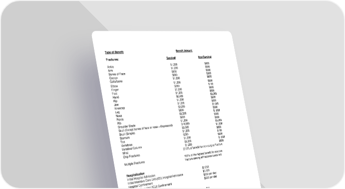 Type of Benefit Benefit Amount Fractures: Surgical Non-Surgical Ankle $1,200 $600 Arm $1,200 $600 Bones of Face $600 $300 Coccyx $600 $300 Collarbone $1,200 $600 Elbow $1,200 $600 Finger $200 $100 Foot $1,200 $600 Hand $1,200 $600 Hip $6,400 $3,200 Jaw $1,200 $600 Kneecap $1,200 $600 Leg $3,200 $1,600 Nose $600 $300 Pelvis $3,200 $1,600 Rib $600 $300 Shoulder Blade $1,200 $600 Skull (Except bones of face or nose – Depressed) $10,000 $5,000 Skull (Simple) $3,000 $1,500 Sternum $1,200 $600 Toe $200 $100 Vertebrae $1,200 $600 Vertebral Column $3,200 $1,600 Wrist $1,200 $600 Chip Fractures 37.5% of benefit for non-surgical fracture Multiple Fractures 150% of the highest benefit for any one fracture among all fractures sustained Hospitalization Initial Hospital Admission $1,000 Initial Intensive Care Unit (ICU) Hospital Admission $1,500 Hospital Confinement $300 per day Intensive Care Unit (ICU) Confinement $600 per day Lacerations No Sutures Required $50 Sutures Required (Total length of all sutured Lacerations) Less than 2” long $100 2” but less than 6” long $400 6” long or greater $800 Lodging $150 per day Medical Appliance $150 Organized Youth Sports 5% of Benefit Amount(s), excluding the Accidental Death and Dismemberment Benefit Paralysis Paraplegia or Hemiplegia $7,500 Quadriplegia $15,000 LRS-9548-0318-IN Page 1.3