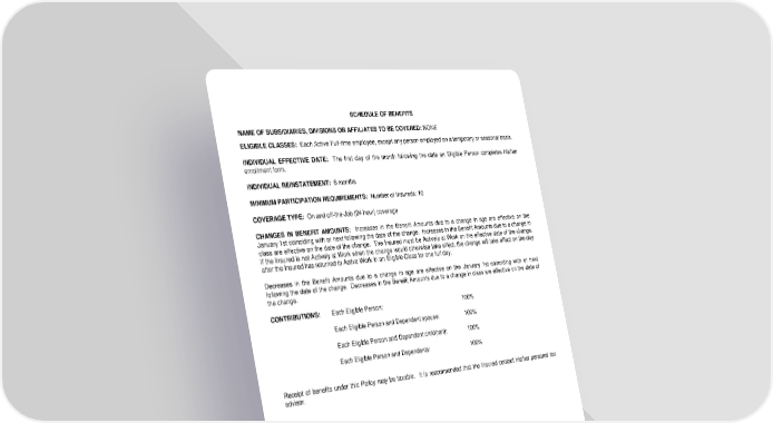 SCHEDULE OF BENEFITS NAME OF SUBSIDIARIES, DIVISIONS OR AFFILIATES TO BE COVERED: NONE ELIGIBLE CLASSES: Each Active Full-time employee, except any person employed on a temporary or seasonal basis. INDIVIDUAL EFFECTIVE DATE: The first day of the month following the date an Eligible Person completes his/her enrollment form. INDIVIDUAL REINSTATEMENT: 6 months MINIMUM PARTICIPATION REQUIREMENTS: Number of Insureds: 10 COVERAGE TYPE: On and off-the-Job (24 hour) coverage CHANGES IN BENEFIT AMOUNTS: Increases in the Benefit Amounts due to a change in age are effective on the January 1st coinciding with or next following the date of the change. Increases in the Benefit Amounts due to a change in class are effective on the date of the change. The Insured must be Actively at Work on the effective date of the change. If the Insured is not Actively at Work when the change would otherwise take effect, the change will take effect on the day after the Insured has returned to Active Work in an Eligible Class for one full day. Decreases in the Benefit Amounts due to a change in age are effective on the January 1st coinciding with or next following the date of the change. Decreases in the Benefit Amounts due to a change in class are effective on the date of the change. CONTRIBUTIONS: Each Eligible Person: 100% Each Eligible Person and Dependent spouse: 100% Each Eligible Person and Dependent child(ren): 100% Each Eligible Person and Dependents: 100% Receipt of benefits under this Policy may be taxable. It is recommended that the Insured contact his/her personal tax advisor. LRS-9547-0318-IN Page 1.0