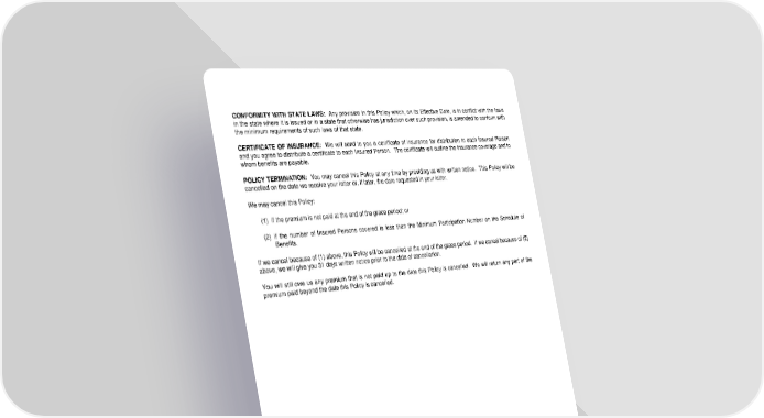 CONFORMITY WITH STATE LAWS: Any provision in this Policy which, on its Effective Date, is in conflict with the laws in the state where it is issued or in a state that otherwise has jurisdiction over such provision, is amended to conform with the minimum requirements of such laws of that state. CERTIFICATE OF INSURANCE: We will send to you a certificate of insurance for distribution to each Insured Person and you agree to distribute a certificate to each Insured Person. The certificate will outline the insurance coverage and to whom benefits are payable. POLICY TERMINATION: You may cancel this Policy at any time by providing us with written notice. This Policy will be cancelled on the date we receive your letter or, if later, the date requested in your letter. We may cancel this Policy: (1) if the premium is not paid at the end of the grace period; or (2) if the number of Insured Persons covered is less than the Minimum Participation Number on the Schedule of Benefits. If we cancel because of (1) above, this Policy will be cancelled at the end of the grace period. If we cancel because of (2) above, we will give you 31 days written notice prior to the date of cancellation. You will still owe us any premium that is not paid up to the date this Policy is cancelled. We will return any part of the premium paid beyond the date this Policy is cancelled. LRS-9547-0318-IN Page 4.1