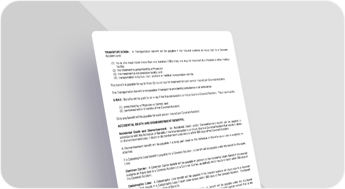 TRANSPORTATION: A Transportation benefit will be payable if the Insured sustains an Injury due to a Covered Accident and: (1) he or she must travel more than one hundred (100) miles one way for treatment at a Hospital or other medical facility; (2) the treatment is prescribed by a Physician; (3) the treatment is not available locally; and (4) transportation is by bus, train, airplane or medical transportation vehicle. This benefit is payable for up to three (3) round trips for treatment for each person insured per Covered Accident. The Transportation benefit is not payable if transport is provided by ambulance or air ambulance. X-RAY: Benefits will be paid for an x-ray if the Insured sustains an Injury due to a Covered Accident. The x-ray must be: (1) prescribed by a Physician or Dentist; and (2) performed within 6 months of the Covered Accident. Only one benefit will be payable for each person insured per Covered Accident. ACCIDENTAL DEATH AND DISMEMBERMENT BENEFITS: Accidental Death and Dismemberment: An Accidental Death and/or Dismemberment benefit will be payable in accordance with the Schedule of Benefits if the Insured sustains an Injury due to a Covered Accident that results in death or dismemberment Loss, if death or dismemberment Loss occurs within 365 days of the Covered Accident. A Dismemberment benefit will be payable if a body part listed on the Schedule of Benefits as a Loss is surgically re- attached. If a Catastrophic Loss benefit is payable for a Covered Accident, no benefit will be payable under this benefit for the same Loss. Common Carrier: A Common Carrier benefit will be payable in addition to the Accidental Death Benefit if the Insured sustains an Injury due to a Covered Accident on a Common Carrier, as defined, which results in death within 365 days of the Covered Accident. Catastrophic Loss: A Catastrophic Loss benefit will be payable if the Insured sustains an Injury due to a Covered Accident that results in a Catastrophic Loss if such Loss occurs within 365 days of the Covered Accident. The benefit payable is shown on the Schedule of Benefits. If a Catastrophic Loss benefit is payable for a Covered Accident, no benefit will be payable under the Accidental Dismemberment benefit for the same Loss. The total benefit payable under this benefit cannot exceed that of the Accidental Death benefit. LRS-9547-0318-IN Page 8.6
