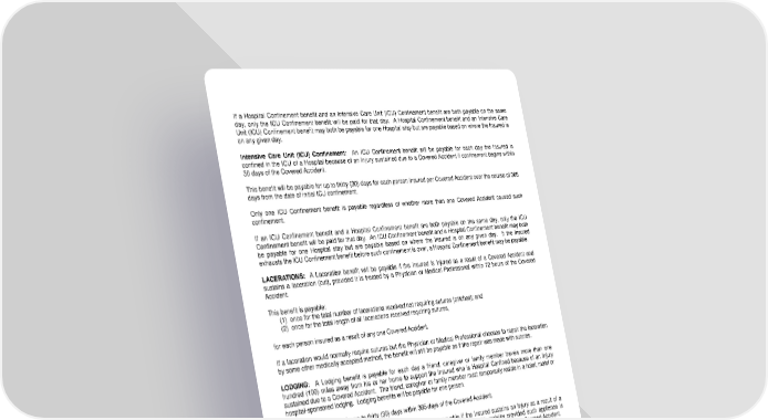 If a Hospital Confinement benefit and an Intensive Care Unit (ICU) Confinement benefit are both payable on the same day, only the ICU Confinement benefit will be paid for that day. A Hospital Confinement benefit and an Intensive Care Unit (ICU) Confinement benefit may both be payable for one Hospital stay but are payable based on where the Insured is on any given day. Intensive Care Unit (ICU) Confinement: An ICU Confinement benefit will be payable for each day the Insured is confined in the ICU of a Hospital because of an Injury sustained due to a Covered Accident if confinement begins within 30 days of the Covered Accident. This benefit will be payable for up to thirty (30) days for each person insured per Covered Accident over the course of 365 days from the date of initial ICU confinement. Only one ICU Confinement benefit is payable regardless of whether more than one Covered Accident caused such confinement. If an ICU Confinement benefit and a Hospital Confinement benefit are both payable on the same day, only the ICU Confinement benefit will be paid for that day. An ICU Confinement benefit and a Hospital Confinement benefit may both be payable for one Hospital stay but are payable based on where the Insured is on any given day. If the Insured exhausts the ICU Confinement benefit before such confinement is over, a Hospital Confinement benefit may be payable. LACERATIONS: A Laceration benefit will be payable if the Insured is Injured as a result of a Covered Accident and sustains a laceration (cut), provided it is treated by a Physician or Medical Professional within 72 hours of the Covered Accident. This benefit is payable: (1) once for the total number of lacerations received not requiring sutures (stitches); and (2) once for the total length of all lacerations received requiring sutures, for each person insured as a result of any one Covered Accident. If a laceration would normally require sutures but the Physician or Medical Professional chooses to repair the laceration by some other medically accepted method, the benefit will still be payable as if the repair was made with sutures. LODGING: A Lodging benefit is payable for each day a friend, caregiver or family member travels more than one hundred (100) miles away from his or her home to support the Insured who is Hospital Confined because of an Injury sustained due to a Covered Accident. The friend, caregiver or family member must temporarily reside in a hotel, motel or hospital-sponsored lodging. Lodging benefits will be payable for one person. This benefit is payable for up to thirty (30) days within 365 days of the Covered Accident. MEDICAL APPLIANCE: A Medical Appliance benefit will be payable if the Insured sustains an Injury as a result of a Covered Accident which requires a Medical Appliance to assist him or her with mobility provided such appliance is prescribed by a Physician or Medical Professional and received by the Insured within 365 days of the Covered Accident. If the Injury sustained is considered a Catastrophic Loss as defined, the Medical Appliance must be prescribed by a Physician or Medical Professional and received by the Insured within 2 years of the Covered Accident. Only one benefit is payable for each person insured per Covered Accident. ORGANIZED YOUTH SPORTS: An additional benefit will be payable if the Insured Dependent child sustains an Injury as a result of a Covered Accident while participating in an Organized Youth Sport. The Insured Dependent child must be age 18 or younger on the date of the Covered Accident. Proof of registration may be required. LRS-9547-0318-IN Page 8.3