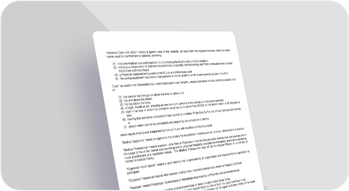 "Intensive Care Unit (ICU)" means a specific area of the Hospital, set apart from the surgical recovery room and other rooms used for confinement of patients, providing: (1) intensive medical care and treatment to only those patients who are in critical condition; (2) continuous observation of and care to patients by a specially trained nursing staff that is dedicated exclusively to the ICU on a 24 hour basis; (3) a Physician assigned exclusively to the ICU on a full-time basis; and (4) life-saving equipment required to treat patients in critical condition which is permanently located in the ICU. "Loss" as used in the Dismemberment and Catastrophic Loss benefits, means severance or total and irrecoverable loss of: (1) the hand or foot through or above the wrist or ankle joint; (2) the arm above the elbow; (3) the leg above the knee; (4) a finger, thumb or toe, including at least one joint, which is either partially or completely severed; (5) sight in an eye in which the corrective visual acuity is worse than 20/200 or the field of vision is 20 degrees or less; (6) hearing that cannot be corrected to hear sounds at or below 70 decibels by the use of any hearing aid or device; or (7) speech which cannot be corrected to any degree by any procedure or device, which results directly and independently from an Injury with no other contributing cause. "Medical Appliance" means an appliance that assists the Insured with mobility such as crutches, wheel chairs, or walkers. "Medical Professional" means a person, other than a Physician or Dentist, that provides medical care and services within the scope of his or her license such as chiropractors, physical therapists, occupational therapists, physician's assistants, nurse practitioners and registered nurses. The Medical Professional may not be the Insured Person or a member of his/her Immediate Family. "Organized Youth Sports" means a sport activity that is governed by an organization and requires formal registration to participate. "Outpatient" means an Insured who receives medical care, treatment and services when not Hospital Confined. "Paralysis" means Paraplegia, Quadriplegia or Hemiplegia diagnosed by a Physician and as defined below: (1) "Paraplegia" means complete and permanent loss of motor function of both lower limbs. (2) "Quadriplegia" means complete and permanent loss of motor function of both the upper and lower limbs. (3) "Hemiplegia" means complete and permanent loss of motor function of the upper and lower limbs of the same side of the body. "Physician" means a duly licensed medical or osteopathic doctor who is recognized by the law of the jurisdiction in which treatment is provided as qualified to treat the type of Injury for which claim is made. The Physician may not be the Insured Person or a member of his/her Immediate Family . "Ranchos Los Amigos Scale" means a system used by the medical profession for measuring levels of awareness, cognition, behavior and interaction with the environment. "Rehabilitation Facility" means any facility or Hospital that is licensed in the jurisdiction in which it is operating to provide rehabilitation services, therapy or retraining to the Insured to enable him or her to walk, communicate, and/or function as a member of society. LRS-9547-0318-IN Page 2.2