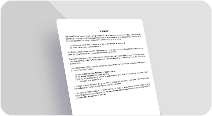 PORTABILITY The Insured Person may continue the Group Accident insurance coverage under this Policy and that of his/her Insured Dependents if coverage would otherwise terminate because he/she ceases to be an Eligible Person, for reasons other than the termination of this Policy or the Insured Person's retirement provided he/she: (1) notifies us in writing within 31 days from the date he/she ceases to be eligible; and (2) remits the necessary premiums when due. The Benefit Amount available under the Portability provision will be the current Benefit Amount the Insured is insured for under this Policy on the last day the Insured Person was Actively at Work. The premium charged to continue coverage will be based on the prevailing rate charged to Insured Persons who choose to continue coverage under the Portability provision. Such premium will be billed directly to the Insured Person on a quarterly basis. Insurance coverage continued under this provision for the Insured Person or his/her Insured Dependents will terminate on the first of the following to occur: (1) the end of the period for which premium has been paid; or (2) the date the Insured Person reaches age 70; or (3) at any time coverage would normally terminate according to the terms of this Policy had the Insured Person continued to be an Eligible Person. In addition, coverage will reduce at any time it would normally reduce according to the terms of this Policy had the Insured Person and Insured Dependent spouse continued to be eligible. If this Policy terminates subsequent to the Insured Person's election to continue his/her coverage and that of his/her Insured Dependents, in accordance with the Portability provision, such coverage will be continued in accordance with the provisions of the Insured Person's certificate. LRS-9547-0318-IN Page 7.0