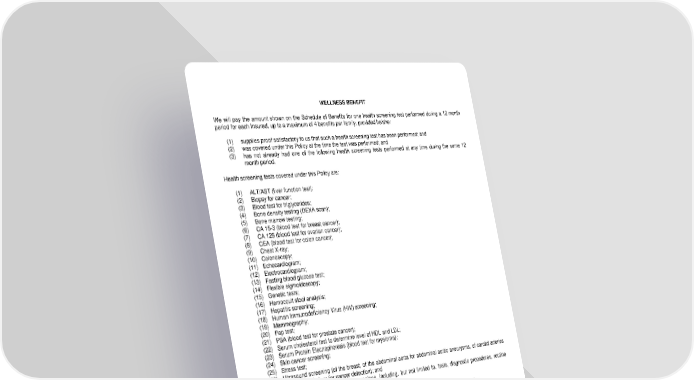 WELLNESS BENEFIT We will pay the amount shown on the Schedule of Benefits for one health screening test performed during a 12 month period for each Insured, up to a maximum of 4 benefits per family, provided he/she: (1) supplies proof satisfactory to us that such a health screening test has been performed; and (2) was covered under this Policy at the time the test was performed; and (3) has not already had one of the following health screening tests performed at any time during the same 12 month period. Health screening tests covered under this Policy are: (1) ALT/AST (liver function test); (2) Biopsy for cancer; (3) Blood test for triglycerides; (4) Bone density testing (DEXA scan); (5) Bone marrow testing; (6) CA 15-3 (blood test for breast cancer); (7) CA 125 (blood test for ovarian cancer); (8) CEA (blood test for colon cancer); (9) Chest X-ray; (10) Colonoscopy; (11) Echocardiogram; (12) Electrocardiogram; (13) Fasting blood glucose test; (14) Flexible sigmoidoscopy; (15) Genetic tests; (16) Hemoccult stool analysis; (17) Hepatitis screening; (18) Human Immunodeficiency Virus (HIV) screening; (19) Mammography; (20) Pap test; (21) PSA (blood test for prostate cancer); (22) Serum cholesterol test to determine level of HDL and LDL; (23) Serum Protein Electrophoresis (blood test for myeloma); (24) Skin cancer screening; (25) Stress test; (26) Ultrasound screening (of the breast, of the abdominal aorta for abdominal aortic aneurysms, of carotid arteries (carotid doppler), or for cancer detection); and (27) Any other preventative health screenings, including, but not limited to, tests, diagnostic procedures, routine examinations and immunizations. The Wellness Benefit is paid in addition to any other payments the Insured may receive under this Policy. LRS-9547-0318-IN Page 9.0