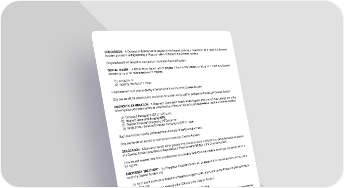 CONCUSSION: A Concussion benefit will be payable if the Insured sustains a Concussion as a result of a Covered Accident provided it is diagnosed by a Physician within 72 hours of the Covered Accident. Only one benefit will be paid for each person insured per Covered Accident. DENTAL INJURY: A Dental Injury benefit will be payable if the Insured sustains an Injury as a result of a Covered Accident to his or her natural teeth which requires: (1) extraction; or (2) repair by insertion of a crown. Initial treatment must be provided by a Dentist within 6 months of the Covered Accident. Only one benefit for extraction and one benefit for a crown will be paid for each person insured per Covered Accident. DIAGNOSTIC EXAMINATION: A Diagnostic Examination benefit will be payable if the Insured must undergo one of the following diagnostic examinations as prescribed by a Physician due to Injury sustained as a result of a Covered Accident: (1) Computed Tomography (CT or CAT) scan; (2) Magnetic Resonance Imaging (MRI); (3) Positron Emission Tomography (PET) scan; or (4) Single Photon Emission Computed Tomography (SPECT) scan. Such examination must be performed within 6 months of the Covered Accident. Only one benefit will be paid for each person insured per Covered Accident. DISLOCATION: A Dislocation benefit will be payable if the Insured sustains a dislocation or partial dislocation as a result of a Covered Accident provided it is diagnosed by a Physician within 90 days of the Covered Accident. If the Insured sustains more than one dislocation as a result of such Covered Accident, we will pay one benefit, which is the highest. EMERGENCY TREATMENT: An Emergency Treatment benefit will be payable if the Insured sustains an Injury as a result of a Covered Accident and: (1) he or she is examined or treated in a Hospital emergency room, urgent care facility, Physician's office or Dentist's office; and (2) emergency treatment is received within 72 hours of the Covered Accident. Only one benefit will be paid for each person insured per Covered Accident. EPIDURAL ANESTHESIA INJECTION: An Epidural Anesthesia Injection benefit will be payable if the Insured receives an epidural injection administered for pain management for an Injury as a result of a Covered Accident. The epidural must be: (1) prescribed by a Physician; (2) administered in a Physician's office or Hospital; and (3) received within 6 months of the Covered Accident. A benefit will not be paid for: (1) an epidural injection administered during a surgical procedure; (2) epidural steroid injections; or (3) an epidural administered during labor and delivery. Only 2 benefits will be paid for each person insured per Covered Accident. LRS-9547-0318-IN Page 8.1