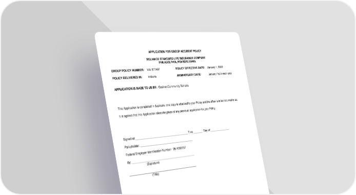APPLICATION FOR GROUP ACCIDENT POLICY RELIANCE STANDARD LIFE INSURANCE COMPANY PHILADELPHIA, PENNSYLVANIA GROUP POLICY NUMBER: VAI 877407 POLICY EFFECTIVE DATE: January 1, 2023 POLICY DELIVERED IN: Indiana ANNIVERSARY DATE: January 1st in each year APPLICATION IS MADE TO US BY: Goshen Community Schools This Application is completed in duplicate, one copy is attached to your Policy and the other is to be returned to us. It is agreed that this Application takes the place of any previous application for your Policy. Signed at:______________________________________ This:_______ Day of:_______________ Policyholder: ______________________________________ Federal Employer Identification Number: 35-1099157 By: _____________________________________________ (Signature) ________________________________________________ (Title) Please sign and return. LRS-9547-0318-IN *BOD