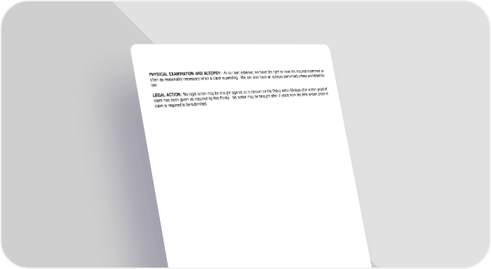 PHYSICAL EXAMINATION AND AUTOPSY: At our own expense, we have the right to have the Insured examined as often as reasonably necessary when a claim is pending. We can also have an autopsy performed unless prohibited by law. LEGAL ACTION: No legal action may be brought against us to recover on this Policy within 60 days after written proof of claim has been given as required by this Policy. No action may be brought after 3 years from the time written proof of claim is required to be submitted. LRS-9547-0318-IN Page 11.1