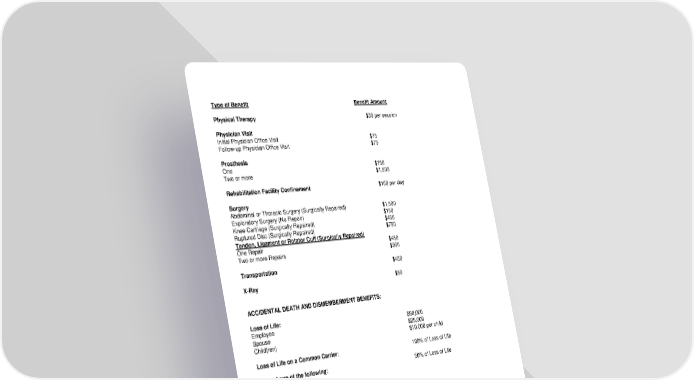 Type of Benefit Benefit Amount Physical Therapy $38 per session Physician Visit Initial Physician Office Visit $75 Follow-up Physician Office Visit $75 Prosthesis One $750 Two or more $1,500 Rehabilitation Facility Confinement $100 per day Surgery Abdominal or Thoracic Surgery (Surgically Repaired) $1,500 Exploratory Surgery (No Repair) $150 Knee Cartilage (Surgically Repaired) $450 Ruptured Disc (Surgically Repaired) $750 Tendon, Ligament or Rotator Cuff (Surgically Repaired) One Repair $450 Two or more Repairs $900 Transportation $450 X-Ray $50 ACCIDENTAL DEATH AND DISMEMBERMENT BENEFITS: Loss of Life: Employee $50,000 Spouse $25,000 Child(ren) $10,000 per child Loss of Life on a Common Carrier: 100% of Loss of Life Loss of one of the following: 50% of Loss of Life Arm Foot Hand Hearing in one ear Leg Sight in one eye Loss of finger, thumb or toe: One Loss 1% of Loss of Life Two or more Losses 3% of Loss of Life Catastrophic Loss as follows: Speech 100% of Loss of Life Two or more Losses, except the Loss of fingers, thumbs or toes 100% of Loss of Life Wellness Benefit: $50 LRS-9547-0318-IN Page 1.4