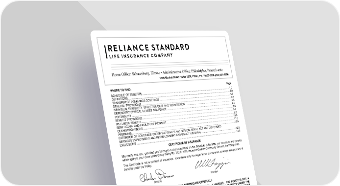 The term "Culturally and Linguistically Appropriate Manner" means: • Oral language services (such as telephone customer assistance hotline) that includes answering questions in any Applicable Non-English Language and providing assistance with filing claims and appeals in any Applicable Non- English Language must be provided; • A notice in any Applicable Non-English Language must be provided upon request; and • A statement prominently displayed in any Applicable Non-English Language clearly indicating how to access the language services provided must be included in the English versions of all notices. The term "Applicable Non-English Language" means: With respect to an address in any United States county to which a notice is sent, a non-English language is an Applicable Non-English Language if ten percent or more of the population residing in the county is literate only in the same non- English language as determined in guidance published by the United States Secretary of Health and Human Services. The term "us" or "our" refers to Reliance Standard Life Insurance Company. The term "Relevant" means: A document, record, or other information shall be considered relevant to a claimant’s claim if such document, record or other information: • Was relied upon in making the benefit determination; • Was submitted, considered, or generated in the course of making the benefit determination, without regard to whether such document, record or other information was relied upon in making the benefit determination; • Demonstrates compliance with administrative processes and safeguards designed to ensure and to verify that benefit claim determinations are made in accordance with governing plan documents and that, where appropriate, the plan provisions have been applied consistently with respect to similarly situated claimants; or • In the case of a plan providing disability benefits, constitutes a statement of policy or guidance with respect to the plan concerning the denied benefit of the claimant’s diagnosis, without regard to whether such advice or statement was relied upon in making the benefit determination. The term "Reliance Standard Life Insurance Company" means Reliance Standard Life Insurance Company and/or its authorized claim administrators. ERISA STATEMENT OF RIGHTS As a participant in the Group Insurance Plan, you may be entitled to certain rights and protections in the event that the Employee Retirement Income Security Act of 1974 (ERISA) applies. ERISA provides that all Plan Participants shall be entitled to: Receive Information About Your Plan and Benefits Examine, without charge, at the Plan Administrator's office and at other specified locations, such as worksites and union halls, all documents governing the Plan, including insurance contracts and collective bargaining agreements, and a copy of the latest annual report (Form 5500 Series) filed by the Plan with the U.S. Department of Labor and available at the Public Disclosure Room of the Employee Benefits Security Administration. Obtain, upon written request to the Plan Administrator, copies of documents governing the operation of the Plan, including
