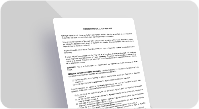 DEPENDENT CRITICAL ILLNESS INSURANCE Nothing in this section will change or affect any of the terms of the Policy other than as specifically set out in this section. All the Policy provisions not in conflict with these provisions shall apply to this section. When an Insured Dependent is Diagnosed with a Critical Illness in accordance with the Critical Illness Benefit provision we will pay the applicable benefit shown on the Schedule of Benefits. Only dependents that meet the definition of Dependent can be insured for this benefit. Any benefit payable for an Insured Dependent will be paid to you unless another individual has been designated as beneficiary. A person may not have coverage under the Policy both as an Insured and as an Insured Dependent. Only one eligible spouse may cover the eligible children as Insured Dependents. The spouse may be covered as a Dependent if not covered as an Insured. If insurance is in force for one Insured Dependent child, any newly eligible Dependent child(ren) will be automatically insured. ELIGIBILITY: You, as an Eligible Person, are eligible to enroll your Dependents on the date you become an Insured Person. EFFECTIVE DATE OF DEPENDENT INSURANCE: If the Policyholder pays the entire premium, the insurance up to any guaranteed issue amount for a Dependent will become effective on the later of: (1) the first day of the month following the date you become eligible to enroll your Dependents for Dependent insurance; or (2) the first day of the month following the date the dependent meets the definition of Dependent. If you are required to pay a portion of the Dependent premium, you may insure your Dependents by making written application. In this case, the insurance for Dependents will take effect on the later of: (1) the first day of the month following the date you become eligible to enroll your Dependents for Dependent Insurance; or (2) the first day of the month following the date the dependent meets the definition of Dependent, if application is made on or before that date; or (3) the first day of the month following the date of application, if application is made within 31 days from the date the Dependent first becomes eligible for this insurance; or (4) the first day of the month following the date we approve any required proof of good health. We require proof of good health if you make application for Dependent spouse insurance: (a) after 31 days from the date the Dependent spouse first becomes eligible for this insurance; or (b) after a prior termination of insurance as long as the Dependent spouse remained eligible for Dependent insurance; or (c) for an Amount of Insurance greater than he/she was insured for with the prior group critical illness plan; or (d) after the Dependent spouse was eligible for coverage under a prior group critical illness plan for more than 31 days but did not elect to be covered under that prior plan; or (5) the date premium is remitted. If the Dependent spouse has been previously declined for coverage by us, had an application withdrawn or marked incomplete for any reason or voluntarily terminated his/her insurance coverage with us, all future requests for coverage are subject to submission and our approval of proof of good health. However, proof of good health will not be required if the Dependent who voluntarily terminated his/her insurance coverage with us makes a future request for insurance coverage due to a life event change or during any approved enrollment period. For a Dependent who is confined in a Hospital or Medical Facility (other than newborn children) or at home on the date on which he/she would otherwise become insured, insurance will be effective as of the date the confinement ends. Changes in the Insured Dependent’s Amount of Insurance are effective as shown on the Schedule of Benefits. LRS-9538-6-0118-IN Page 6.0
