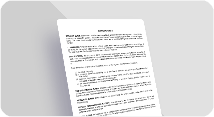 CLAIMS PROVISIONS NOTICE OF CLAIM: Written notice must be given to us within 31 days after the date of the Diagnosis of a Critical Illness, or as soon as reasonably possible. The notice should be sent to us at our Administrative Offices or to our authorized agent. The notice should include the Policyholder's Name, your or your Insured Dependent's name and the Policy Number. CLAIM FORMS: When we receive written notice of a claim, we will send claim forms to the claimant within 15 days. If we do not, the claimant will satisfy the requirements of written proof of loss by sending us written proof as shown below. The proof must describe the occurrence, character, and extent of the loss. PROOF OF LOSS: For any covered Critical Illness or health screening test, written proof must be sent to us within 90 days. If it is not reasonably possible to give proof within 90 days, the claim is not affected if the proof is sent as soon as reasonably possible. In any event, proof must be given within one year, unless the claimant is legally incapable of doing so. Proof of Loss for a covered Critical Illness must include, at your expense, all of the following information: (1) the date of Diagnosis; (2) a completed claim form signed by you or your Insured Dependent and your or your Insured Dependent's Physician(s); (3) supporting documentation from the Physician, including but not limited to, clinical, radiological, pathological; histological or laboratory evidence of Critical Illness; and (4) the name and address of any Hospital or Medical Facility, as well as the Physician, providing Treatment prior to the Diagnosis. TIME OF PAYMENT OF CLAIMS: When we receive satisfactory written proof of loss, we will pay any benefits due within 30 days if the claim was submitted electronically. If the claim was not submitted electronically, we will pay any benefits due within 45 days. Benefits that provide for periodic payment will be paid accordingly. PAYMENT OF CLAIMS: All benefits will be paid to you, if living. Any benefits unpaid at the time of death will be paid to the beneficiary. PHYSICAL EXAMINATION AND AUTOPSY: At our own expense, we will have the right to have you or your Insured Dependent examined as often as reasonably necessary when a claim is pending. We can also have an autopsy performed unless prohibited by law. LEGAL ACTION: No legal action may be brought against us to recover on the Policy within 60 days after written proof of loss has been given as required by the Policy. No action may be brought after three years from the time written proof of loss is required to be submitted. LRS-9538-11-0118-IN Page 11.0