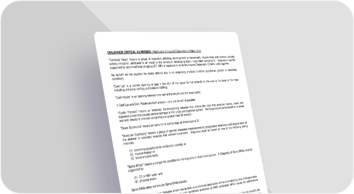CHILDHOOD CRITICAL ILLNESSES: (Applicable to Insured Dependent children only) "Cerebral Palsy" means a group of disorders affecting development of movement, muscle tone and posture causing activity limitation, attributed to an insult to the immature, developing brain, most often before birth. Diagnosis must be supported by abnormal brain imaging (CT, MRI or equivalent) while the Insured Dependent Child is under age five. No benefit will be payable for motor deficits due to an underlying medical condition (syndrome, genetic or hereditary condition). "Cleft Lip" is a narrow opening or gap in the skin of the upper lip that extends all the way to the base of the nose, including unilateral clefting and bilateral clefting. "Cleft Palate" is an opening between the roof of the mouth and the nasal cavity. If Cleft Lip and Cleft Palate are both present, only one benefit is payable. "Cystic Fibrosis" means an inherited, life-threatening disorder that affects the cells that produce mucus, sweat and digestive juices that causes severe damage to the lungs and digestive system. The Diagnosis must be based on a sweat test with results of chloride concentrations greater than 60 mmol/L. "Down Syndrome" means an extra full or partial copy of chromosome 21. "Muscular Dystrophy" means a group of genetic diseases characterized by progressive weakness and degeneration of the skeletal or voluntary muscles that control movement. Diagnosis must be based on one of the following testing methods: (1) electromyography/nerve conduction velocity; or (2) muscle biopsy; or (3) blood enzyme tests. "Spina Bifida" means a congenital condition of meningocele or myelomeningocele. A Diagnosis of Spina Bifida must be supported by: (1) CT or MRI scan; and (2) physical exam. Spina Bifida does not include Spina Bifida occulta. "Type 1 Diabetes" means diabetes which results from auto-immune destruction of insulin-producing cells in the pancreas. Diagnosis must be based on blood tests and confirmed presence of GAD antibodies which cause an autoimmune reaction to beta cells. CONCURRENT DIAGNOSIS OF MORE THAN ONE CRITICAL ILLNESS: If the Insured can qualify for benefits for more than one Critical Illness at the same time, (within the Recurrence or Subsequent Occurrence separation period), we will only pay for one Critical Illness with the highest benefit. RECURRENCE(S) OF A CRITICAL ILLNESS: Once an Insured has been Diagnosed with a Critical Illness and a Critical Illness Benefit has become payable, a benefit will be payable for a Recurrence of the same Critical Illness, provided the Recurrence is Diagnosed at least twelve (12) months after the previous Critical Illness was Diagnosed. The benefit payable for a Recurrence will be as shown on the Schedule of Benefits. SUBSEQUENT OCCURRENCE(S) OF A CRITICAL ILLNESS: Once an Insured has been Diagnosed with a Critical Illness and a Critical Illness Benefit has become payable, benefits will be payable for subsequent and unrelated Critical Illnesses if the Critical Illness is Diagnosed at least three (3) months after the previous Critical Illness was Diagnosed. The benefit payable for Subsequent Occurrence(s) will be as shown on the Schedule of Benefits. DEATH OF THE INSURED: If an Insured is Diagnosed with a Critical Illness and is eligible for a benefit but dies before a LRS-9538-8-0118 Page 8.4