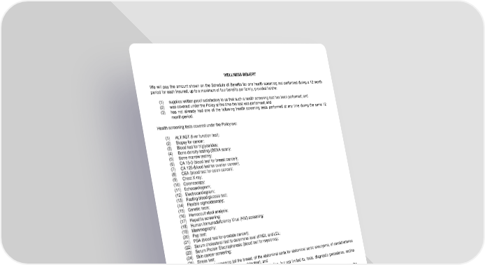 WELLNESS BENEFIT We will pay the amount shown on the Schedule of Benefits for one health screening test performed during a 12 month period for each Insured, up to a maximum of four benefits per family, provided he/she: (1) supplies written proof satisfactory to us that such a health screening test has been performed; and (2) was covered under the Policy at the time the test was performed; and (3) has not already had one of the following health screening tests performed at any time during the same 12 month period. Health screening tests covered under the Policy are: (1) ALT/AST (liver function test); (2) Biopsy for cancer; (3) Blood test for triglycerides; (4) Bone density testing (DEXA scan); (5) Bone marrow testing; (6) CA 15-3 (blood test for breast cancer); (7) CA 125 (blood test for ovarian cancer); (8) CEA (blood test for colon cancer); (9) Chest X-ray; (10) Colonoscopy; (11) Echocardiogram; (12) Electrocardiogram; (13) Fasting blood glucose test; (14) Flexible sigmoidoscopy; (15) Genetic tests; (16) Hemoccult stool analysis; (17) Hepatitis screening; (18) Human Immunodeficiency Virus (HIV) screening; (19) Mammography; (20) Pap test; (21) PSA (blood test for prostate cancer); (22) Serum cholesterol test to determine level of HDL and LDL; (23) Serum Protein Electrophoresis (blood test for myeloma); (24) Skin cancer screening; (25) Stress test; (26) Ultrasound screening (of the breast, of the abdominal aorta for abdominal aortic aneurysms, of carotid arteries (carotid doppler), or for cancer detection); and (27) Any other preventative health screenings, including, but not limited to, tests, diagnostic procedures, routine examinations and immunizations. The Wellness Benefit is paid in addition to any other payments you or your Insured Dependents may receive under the Policy. LRS-9538-9-0118 Page 9.0