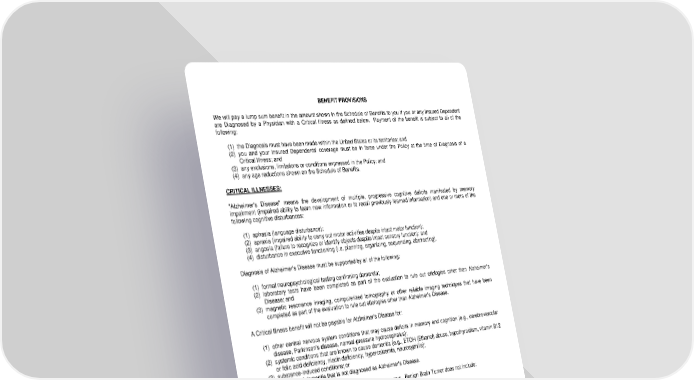 BENEFIT PROVISIONS We will pay a lump sum benefit in the amount shown in the Schedule of Benefits to you if you or any Insured Dependent are Diagnosed by a Physician with a Critical Illness as defined below. Payment of the benefit is subject to all of the following: (1) the Diagnosis must have been made within the United States or its territories; and (2) you and your Insured Dependents' coverage must be in force under the Policy at the time of Diagnosis of a Critical Illness; and (3) any exclusions, limitations or conditions expressed in the Policy; and (4) any age reductions shown on the Schedule of Benefits. CRITICAL ILLNESSES: "Alzheimer's Disease" means the development of multiple, progressive cognitive deficits manifested by memory impairment (impaired ability to learn new information or to recall previously learned information) and one or more of the following cognitive disturbances: (1) aphasia (language disturbance); (2) apraxia (impaired ability to carry out motor activities despite intact motor function); (3) angosia (failure to recognize or identify objects despite intact sensory function); and (4) disturbance in executive functioning (i.e. planning, organizing, sequencing, abstracting). Diagnosis of Alzheimer's Disease must be supported by all of the following: (1) formal neuropsychological testing confirming dementia; (2) laboratory tests have been completed as part of the evaluation to rule out etiologies other than Alzheimer's Disease; and (3) magnetic resonance imaging, computerized tomography or other reliable imaging techniques that have been completed as part of the evaluation to rule out etiologies other than Alzheimer's Disease. A Critical Illness benefit will not be payable for Alzheimer's Disease for: (1) other central nervous system conditions that may cause deficits in memory and cognition (e.g., cerebrovascular disease, Parkinson's disease, normal-pressure hydrocephalus); (2) systemic conditions that are known to cause dementia (e.g., ETOH (Ethanol) abuse, hypothyroidism, vitamin B12 or folic acid deficiency, niacin deficiency, hypercalcemia, neurosyphilis); (3) substance-induced conditions; or (4) any form of dementia that is not diagnosed as Alzheimer's Disease. "Benign Brain Tumor" means a brain tumor that is not cancerous. Benign Brain Tumor does not include: (1) tumors of the skull; (2) pituitary adenomas; or (3) germanomas. "Carcinoma in situ" means cancer in which the tumor cells still lie within the tissue of the site of origin without having invaded neighboring tissue. The term "Carcinoma in situ" does not mean: (1) pre-malignant lesions such as intraepithelial neoplasia; (2) malignant melanoma of less than .75 mm. maximum thickness as determined by histological examination using the Breslow method; or (3) benign tumors or polyps. Carcinoma in situ must be Diagnosed pursuant to a pathological diagnosis. We will, however, pay benefits based on a clinical diagnosis if pathological diagnosis is impossible because it is life threatening or medically inappropriate. LRS-9538-8-0118 Page 8.0