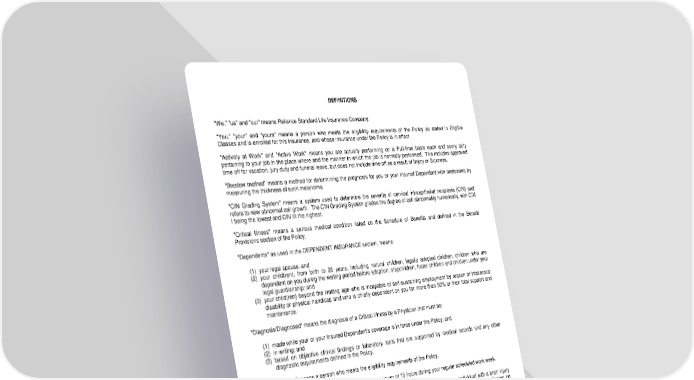 DEFINITIONS "We," "us" and "our" means Reliance Standard Life Insurance Company. "You," "your" and "yours" means a person who meets the eligibility requirements of the Policy as stated in Eligible Classes and is enrolled for this insurance, and whose insurance under the Policy is in effect. "Actively at Work" and "Active Work" means you are actually performing on a Full-time basis each and every duty pertaining to your job in the place where and the manner in which the job is normally performed. This includes approved time off for vacation, jury duty and funeral leave, but does not include time off as a result of Injury or Sickness. "Breslow method" means a method for determining the prognosis for you or your Insured Dependent with melanoma by measuring the thickness of such melanoma. "CIN Grading System" means a system used to determine the severity of cervical intraepithelial neoplasia (CIN) and refers to new abnormal cell growth. The CIN Grading System grades the degree of cell abnormality numerically, with CIN I being the lowest and CIN III the highest. "Critical Illness" means a serious medical condition listed on the Schedule of Benefits and defined in the Benefit Provisions section of the Policy. "Dependents" as used in the DEPENDENT INSURANCE section, means: (1) your legal spouse; and (2) your child(ren), from birth to 26 years, including natural children, legally adopted children, children who are dependent on you during the waiting period before adoption, stepchildren, foster children and children under your legal guardianship; and (3) your child(ren) beyond the limiting age who is incapable of self-sustaining employment by reason of intellectual disability or physical handicap and who is chiefly dependent on you for more than 50% or their total support and maintenance. "Diagnosis/Diagnosed" means the diagnosis of a Critical Illness by a Physician that must be: (1) made while your or your Insured Dependent's coverage is in force under the Policy; and (2) in writing; and (3) based on objective clinical findings or laboratory tests that are supported by medical records and any other diagnostic requirements defined in the Policy. "Eligible Person" means a person who meets the eligibility requirements of the Policy. "Full-time" means working for the Policyholder for a minimum of 15 hours during your regular scheduled work week. "Glasgow Coma Scale" means a system for assessing the severity of brain impairment in an individual with a brain injury that uses the sum of scores given for eye-opening, verbal, and motor responses. A high score of 15 indicates no impairment and a score of 7 or less indicates severe impairment. "Gleason Score" means a system of grading prostate cancer tissue based on how it looks under a microscope. Gleason scores range from 2 to 10 and indicate how likely it is that a tumor will spread. A low Gleason Score means the cancer tissue is similar to normal prostate tissue and the tumor is less likely to spread. A high Gleason Score means the cancer tissue is very different from normal and the tumor is more likely to spread. "Hospital or Medical Facility" means a legally operated, accredited facility licensed to provide full-time care and Treatment for the condition for which benefits are payable under the Policy. It is operated with a full-time staff of licensed Physicians and registered nurses. It does not include facilities that primarily provide custodial or rehabilitative care, education or long-term institutional care on a residential basis. "Immediate Family" means you or your Insured Dependent's parents, siblings, spouse or children. LRS-9538-2-0118-IN Page 2.0