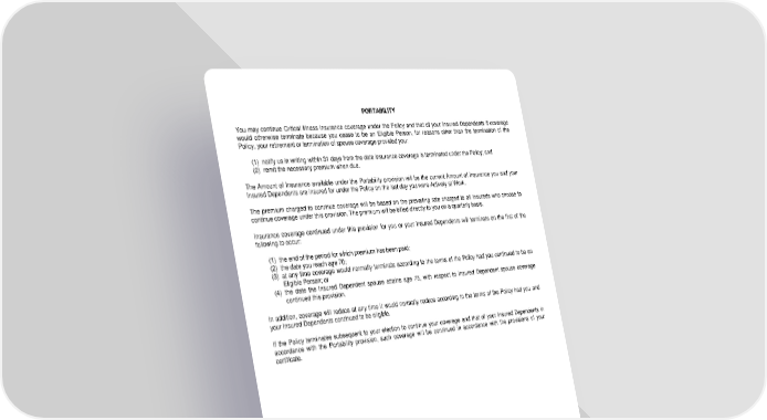 PORTABILITY You may continue Critical Illness insurance coverage under the Policy and that of your Insured Dependents if coverage would otherwise terminate because you cease to be an Eligible Person, for reasons other than the termination of the Policy, your retirement or termination of spouse coverage provided you: (1) notify us in writing within 31 days from the date insurance coverage is terminated under the Policy; and (2) remit the necessary premium when due. The Amount of Insurance available under the Portability provision will be the current Amount of Insurance you and your Insured Dependents are insured for under the Policy on the last day you were Actively at Work. The premium charged to continue coverage will be based on the prevailing rate charged to all Insureds who choose to continue coverage under this provision. The premium will be billed directly to you on a quarterly basis. Insurance coverage continued under this provision for you or your Insured Dependents will terminate on the first of the following to occur: (1) the end of the period for which premium has been paid; (2) the date you reach age 70; (3) at any time coverage would normally terminate according to the terms of the Policy had you continued to be an Eligible Person; or (4) the date the Insured Dependent spouse attains age 75, with respect to Insured Dependent spouse coverage continued this provision. In addition, coverage will reduce at any time it would normally reduce according to the terms of the Policy had you and your Insured Dependents continued to be eligible. If the Policy terminates subsequent to your election to continue your coverage and that of your Insured Dependents in accordance with the Portability provision, such coverage will be continued in accordance with the provisions of your certificate. LRS-9538-7-0118 Page 7.0