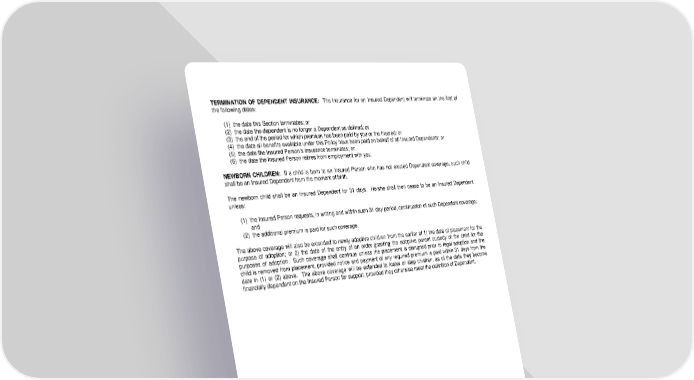 TERMINATION OF DEPENDENT INSURANCE: The insurance for an Insured Dependent will terminate on the first of the following dates: (1) the date this Section terminates; or (2) the date the dependent is no longer a Dependent as defined; or (3) the end of the period for which premium has been paid by you or the Insured; or (4) the date all benefits available under this Policy have been paid on behalf of all Insured Dependents; or (5) the date the Insured Person’s insurance terminates; or (6) the date the Insured Person retires from employment with you. NEWBORN CHILDREN: If a child is born to an Insured Person who has not elected Dependent coverage, such child shall be an Insured Dependent from the moment of birth. The newborn child shall be an Insured Dependent for 31 days. He/she shall then cease to be an Insured Dependent unless: (1) the Insured Person requests, in writing and within such 31 day period, continuation of such Dependent coverage; and (2) the additional premium is paid for such coverage. The above coverage will also be extended to newly adoptive children from the earlier of 1) the date of placement for the purpose of adoption; or 2) the date of the entry of an order granting the adoptive parent custody of the child for the purposes of adoption. Such coverage shall continue unless the placement is disrupted prior to legal adoption and the child is removed from placement, provided notice and payment of any required premium is paid within 31 days from the date in (1) or (2) above. The above coverage will be extended to foster or step children, as of the date they become financially dependent on the Insured Person for support, provided they otherwise meet the definition of Dependent. LRS-9537-7-0118-IN Page 7.1