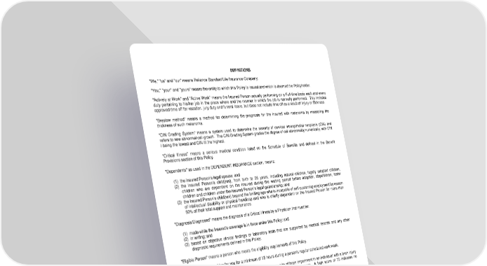 DEFINITIONS "We," "us" and "our" means Reliance Standard Life Insurance Company. "You," "your" and "yours" means the entity to which this Policy is issued and which is deemed the Policyholder. "Actively at Work" and "Active Work" means the Insured Person actually performing on a Full-time basis each and every duty pertaining to his/her job in the place where and the manner in which the job is normally performed. This includes approved time off for vacation, jury duty and funeral leave, but does not include time off as a result of Injury or Sickness. "Breslow method" means a method for determining the prognosis for the Insured with melanoma by measuring the thickness of such melanoma. "CIN Grading System" means a system used to determine the severity of cervical intraepithelial neoplasia (CIN) and refers to new abnormal cell growth. The CIN Grading System grades the degree of cell abnormality numerically, with CIN I being the lowest and CIN III the highest. “Critical Illness” means a serious medical condition listed on the Schedule of Benefits and defined in the Benefit Provisions section of this Policy. "Dependents" as used in the DEPENDENT INSURANCE section, means: (1) the Insured Person’s legal spouse; and (2) the Insured Person’s child(ren), from birth to 26 years, including natural children, legally adopted children, children who are dependent on the Insured during the waiting period before adoption, stepchildren, foster children and children under the Insured Person’s legal guardianship; and (3) the Insured Person’s child(ren) beyond the limiting age who is incapable of self-sustaining employment by reason of intellectual disability or physical handicap and who is chiefly dependent on the Insured Person for more than 50% of their total support and maintenance. "Diagnosis/Diagnosed" means the diagnosis of a Critical Illness by a Physician that must be: (1) made while the Insured’s coverage is in force under this Policy; and (2) in writing; and (3) based on objective clinical findings or laboratory tests that are supported by medical records and any other diagnostic requirements defined in this Policy. "Eligible Person" means a person who meets the eligibility requirements of this Policy. "Full-time" means working for you for a minimum of 15 hours during a person's regular scheduled work week. "Glasgow Coma Scale" means a system for assessing the severity of brain impairment in an individual with a brain injury that uses the sum of scores given for eye-opening, verbal, and motor responses. A high score of 15 indicates no impairment and a score of 7 or less indicates severe impairment. "Gleason Score" means a system of grading prostate cancer tissue based on how it looks under a microscope. Gleason scores range from 2 to 10 and indicate how likely it is that a tumor will spread. A low Gleason Score means the cancer tissue is similar to normal prostate tissue and the tumor is less likely to spread. A high Gleason Score means the cancer tissue is very different from normal and the tumor is more likely to spread. "Hospital or Medical Facility" means a legally operated, accredited facility licensed to provide full-time care and Treatment for the condition for which benefits are payable under this Policy. It is operated with a full-time staff of licensed Physicians and registered nurses. It does not include facilities that primarily provide custodial or rehabilitative care, education or long-term institutional care on a residential basis. "Immediate Family" means the parents, siblings, spouse or children of an Insured. "Injury" means bodily injury to the Insured resulting directly from an accident, independent of all other causes. "Insured" means a person whose insurance under this Policy is in effect. LRS-9537-2-0118-IN Page 2.0