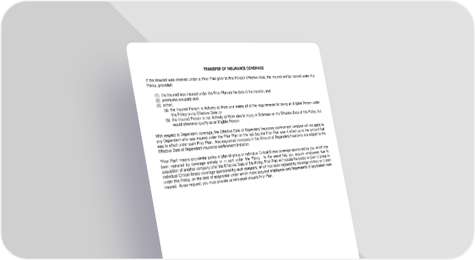 TRANSFER OF INSURANCE COVERAGE If the Insured was covered under a Prior Plan prior to this Policy's Effective Date, the Insured will be insured under this Policy, provided; (1) the Insured was insured under the Prior Plan on the date of the transfer; and (2) premiums are paid; and (3) either; (a) the Insured Person is Actively at Work and meets all of the requirements for being an Eligible Person under this Policy on its Effective Date; or (b) the Insured Person is not Actively at Work due to Injury or Sickness on the Effective Date of this Policy, but would otherwise qualify as an Eligible Person. With respect to Dependent coverage, the Effective Date of Dependent Insurance confinement limitation will not apply to any Dependent who was insured under the Prior Plan on the last day the Prior Plan was in effect up to the amount that was in effect under such Prior Plan. Any requested increases in the Amount of Dependent Insurance are subject to the Effective Date of Dependent Insurance confinement limitation. "Prior Plan" means any similar policy or plan of group or individual Critical Illness coverage sponsored by you, which has been replaced by coverage entirely or in part under this Policy. In the event that you acquire employees due to acquisition of another company after the Effective Date of this Policy, Prior Plan will include the policy or plan of group or individual Critical Illness coverage sponsored by such company, which has been replaced by coverage entirely or in part under this Policy, on the date of acquisition under which those acquired employees and Dependents (if applicable) were insured. At our request, you must provide us with proof of such Prior Plan. LRS-9537-4-0118 Page 4.0