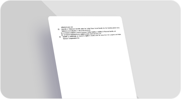 retirement plan; and (8) disability or Retirement benefits under the United States Social Security Act, the Canadian pension plans, federal or provincial plans, or any similar law which: (a) an Insured is eligible to receive because of his/her disability or eligibility for Retirement benefits; and (b) an Insured's dependents are eligible to receive due to (a) above; and (9) benefits or settlements an Insured is eligible to receive under the Jones Act or the Longshore and Harbor Workers' Compensation Act. LRS-6451-8-0113 Page 7.2