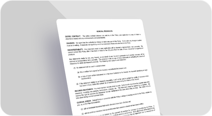 GENERAL PROVISIONS ENTIRE CONTRACT: The entire contract between you and us is this Policy, your application (a copy of which is attached at issue) and any endorsements and amendments. CHANGES: No agent has the authority to change or waive any part of this Policy. To be valid, any change or waiver must be in writing. It must also be signed by one of our executive officers and attached to this Policy. INCONTESTABILITY: Any statement made in your application will be deemed a representation, not a warranty. We cannot contest this Policy after it has been in force for two (2) years from the date of issue, except for non-payment of premium. Any statements made by you, any Insured, or on behalf of any Insured to persuade us to provide coverage, will be deemed a representation not a warranty. This provision limits our use of these statements in contesting the amount of insurance for which an Insured is covered. The following rules apply to each statement: (1) No statement will be used in contest unless: (a) it is in written form signed by the Insured, or on behalf of the Insured; and (b) a copy of such written instrument is or has been furnished to the Insured, the Insured's beneficiary or legal representative. (2) If the statement relates to an Insured's insurability, it will not be used to contest the validity of insurance which has been in force, before the contest, for at least two (2) years during the lifetime of the Insured. RECORDS MAINTAINED: You must maintain records of all Insureds. Such records must show the essential data of the insurance, including new persons, terminations, changes, etc. This information must be reported to us regularly. We reserve the right to examine the insurance records maintained at the place where they are kept. This review will only take place during normal business hours. CLERICAL ERROR: Clerical Errors in connection with this Policy or delays in keeping records for this Policy, whether by you, us, or the Plan Administrator: (1) will not terminate insurance that would otherwise have been effective; and (2) will not continue insurance that would otherwise have ceased or should not have been in effect. Clerical Errors include (but are not limited to) the payment of premium for coverage not provided by this Policy. If appropriate, a fair adjustment of premium will be made to correct a clerical error. Such adjustments will be limited to the twelve (12) month period preceding the date we receive proof from you that an adjustment due to overpayment of premium should be made or the date we discover that premium has been underpaid. MISSTATEMENT OF AGE: If an Insured's age is misstated, the premium will be adjusted. If the Insured's insurance is affected by the misstated age, it will also be adjusted. The insurance will be changed to the amount the Insured is entitled to at his/her correct age. NOT IN LIEU OF WORKERS' COMPENSATION: This Policy is not a Workers' Compensation Policy. It does not provide Workers' Compensation benefits. CONFORMITY WITH STATE LAWS: Any section of this Policy, which on its effective date, conflicts with the laws of the state in which this Policy is issued, is amended by this provision. This Policy is amended to meet the minimum requirements of those laws. CERTIFICATE OF INSURANCE: We will send to you an individual certificate for each Insured. The certificate will outline the insurance coverage and to whom benefits are payable. TERMINATION OF THE POLICY: You may cancel this Policy at any time. This Policy will be cancelled on the date we receive your letter or, if later, the date requested in your letter. LRS-6451-5 Ed.5/16 Page 4.0