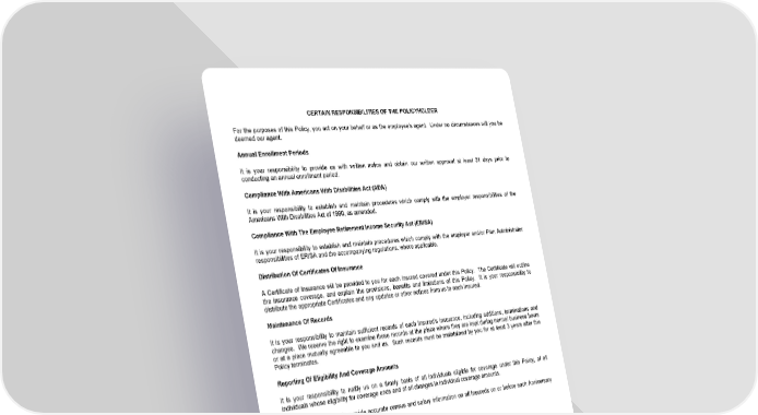 CERTAIN RESPONSIBILITIES OF THE POLICYHOLDER For the purposes of this Policy, you act on your behalf or as the employee's agent. Under no circumstances will you be deemed our agent. Annual Enrollment Periods It is your responsibility to provide us with written notice and obtain our written approval at least 31 days prior to conducting an annual enrollment period. Compliance With Americans With Disabilities Act (ADA) It is your responsibility to establish and maintain procedures which comply with the employer responsibilities of the Americans With Disabilities Act of 1990, as amended. Compliance With The Employee Retirement Income Security Act (ERISA) It is your responsibility to establish and maintain procedures which comply with the employer and/or Plan Administrator responsibilities of ERISA and the accompanying regulations, where applicable. Distribution Of Certificates Of Insurance A Certificate of Insurance will be provided to you for each Insured covered under this Policy. The Certificate will outline the insurance coverage, and explain the provisions, benefits and limitations of this Policy. It is your responsibility to distribute the appropriate Certificates and any updates or other notices from us to each Insured. Maintenance Of Records It is your responsibility to maintain sufficient records of each Insured's insurance, including additions, terminations and changes. We reserve the right to examine these records at the place where they are kept during normal business hours or at a place mutually agreeable to you and us. Such records must be maintained by you for at least 3 years after this Policy terminates. Reporting Of Eligibility And Coverage Amounts It is your responsibility to notify us on a timely basis of all individuals eligible for coverage under this Policy, of all individuals whose eligibility for coverage ends and of all changes in individual coverage amounts. It is your responsibility to provide accurate census and salary information on all Insureds on or before each Anniversary Date, if we request such information. Timely Payment Of Premiums It is your responsibility to pay all premiums required under this Policy when due. Any change in the premium contribution basis must be approved by us. LRS-6451-227-0406 Page 3.0