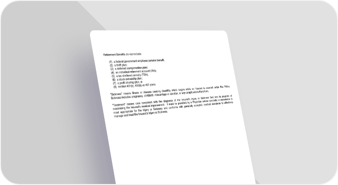 Retirement Benefits do not include: (1) a federal government employee pension benefit; (2) a thrift plan; (3) a deferred compensation plan; (4) an individual retirement account (IRA); (5) a tax sheltered annuity (TSA); (6) a stock ownership plan; (7) a profit sharing plan; or (8) section 401(k), 403(b) or 457 plans. "Sickness" means illness or disease causing disability which begins while an Insured is covered under this Policy. Sickness includes pregnancy, childbirth, miscarriage or abortion, or any complications therefrom. "Treatment" means care consistent with the diagnosis of the Insured's Injury or Sickness that has its purpose of maximizing the Insured's medical improvement. It must be provided by a Physician whose specialty or experience is most appropriate for the Injury or Sickness and conforms with generally accepted medical standards to effectively manage and treat the Insured's Injury or Sickness. LRS-6451-3 Ed. 4/06 Page 2.1