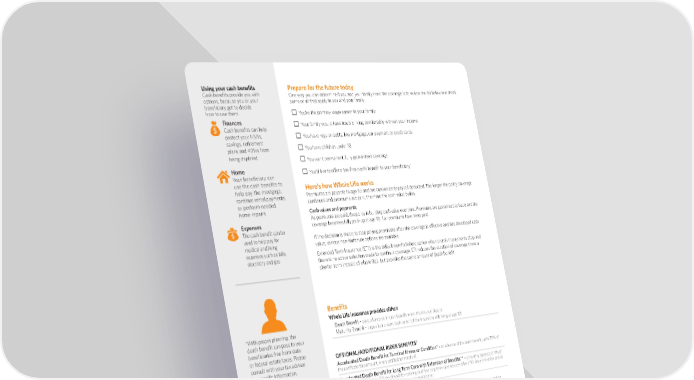 Using your cash bene昀椀ts Prepare for the future today Cash bene昀椀ts provide you with One way you can determine if you and your family need the coverage is to review the list below and check options, because you or your some or all that apply to you and your family bene昀椀ciary get to decide . how to use them. You’re the primary wage earner in your family Finances Your family would have trouble living comfortably without your income Cash bene昀椀ts can help protect your HSAs, You have regular debts, like mortgage, car payment or credit cards savings, retirement plans and 401ks from You have children under 18 being depleted You want permanent, fully guaranteed coverage Home † Your beneficiary can You'd like to o昀昀er a tax-free death bene昀椀t to your bene昀椀ciary use the cash benefits to Here’s how Whole Life works help pay the mortgage, Premiums are payable to age 95 and are conveniently payroll deducted. The longer the policy coverage continue rental payments, continues and or perform needed premiums are paid, the more the cash value builds. home repairs Cash values and payments Expenses As premiums are paid, the policy is building cash value over time. Premiums are guaranteed at issue and the The cash bene昀椀t can be coverage becomes fully paid-up at age 95 if all premiums have been paid. used to help pay for If the decision is made to stop paying premiums after the coverage is e昀昀ective and has developed cash medical and living value, various non-forfeiture options are available. expenses such as bills, Extended Term Insurance (ETI) is the default non-forfeiture option when premium payments stop and electricity and gas there is no active selection made to continue coverage. ETI reduces the duration of coverage (now a shorter term instead of whole life), but provides the same amount of death bene昀椀t. Bene昀椀ts Whole Life Insurance provides either: Death Bene昀椀t - pays a lump-sum cash bene昀椀t when the insured dies; or † With proper planning, the Maturity Bene昀椀t - pays a lump-sum cash bene昀椀t if the insured is still living at age 121 death bene昀椀t can pass to your bene昀椀ciaries free from state or federal estate taxes. Please 3 consult with your tax advisor OPTIONAL/ADDITIONAL RIDER BENEFITS for speci昀椀c information. Accelerated Death Bene昀椀t for Terminal Illness or Condition* -^ an advance of the death bene昀椀t, up to 75% of the certi昀椀cate face amount, when certi昀椀ed terminally ill You may be required to answer Accelerated Death Bene昀椀t for Long Term Care with Extension of Bene昀椀ts** -^ a monthly advance of 4% of health questions at enrollment. the death bene昀椀t for up to 50 months while receiving quali昀椀ed long-term care services after a 90-day elimination period Coverage may be available with when certi昀椀ed chronically ill by a licensed health care practitioner reduced underwriting through your employer during your initial 3 enrollment period. If you enroll The riders have exclusions and limitations, may vary in availability by issue or termination age, and may not be available to all covered dependents or in all states. Additional premiums may be required for riders added to coverage. after your initial enrollment *Premiums are waived after payment of bene昀椀t. **Premiums are waived for the months when the bene昀椀t is payable. period, answers to health questions are required. GWLBIN 3 POD126436