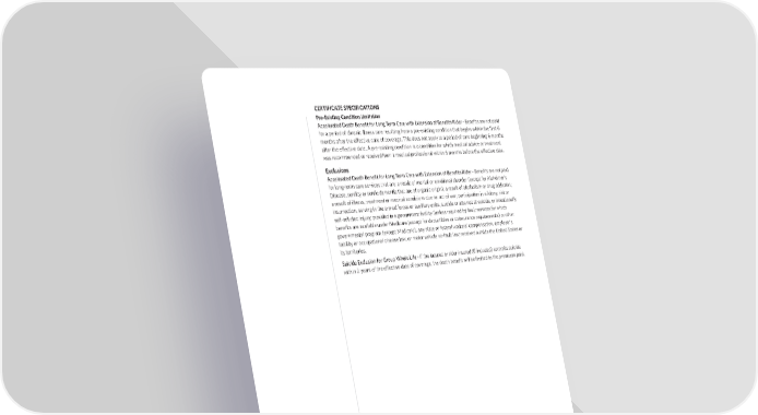 CERTIFICATE SPECIFICATIONS Pre-Existing Condition Limitation Accelerated Death Bene昀椀t for Long Term Care with Extension of Bene昀椀ts Rider - ^ Bene昀椀ts are not paid for a period of chronic illness care resulting from a pre-existing condition that begins within the 昀椀rst 6 months after the e昀昀ective date of coverage. This does not apply to a period of care beginning 6 months after the e昀昀ective date. A pre-existing condition is a condition for which medical advice or treatment was recommended or received from a medical professional within 6 months before the e昀昀ective date. Exclusions Accelerated Death Bene昀椀t for Long Term Care with Extension of Bene昀椀ts Rider -^ Bene昀椀ts are not paid for long-term care services that are: a result of mental or emotional disorder (except for Alzheimer's Disease, senility or senile dementia that are of organic origin); a result of alcoholism or drug addiction; a result of illness, treatment or medical conditions due to: act of war, participation in a felony, riot or insurrection, serving in the armed forces or auxiliary units, suicide or attempt at suicide, or intentionally self-in昀氀icted injury; provided in a government facility (unless required by law); services for which bene昀椀ts are available under Medicare (except for deductibles or coinsurance requirements) or other governmental program (except Medicaid), any state or federal workers' compensation, employer's liability or occupational disease law, or motor vehicle no-fault law; received outside the United States or its territories. Suicide Exclusion for Group Whole Life - ^If the insured or rider insured (if included) commits suicide within 2 years of the e昀昀ective date of coverage, the death bene昀椀t will be limited to the premiums paid. This brochure is for use in enrollments sitused in IN. This advertisement is a solicitation of insurance; contact may be made by an Allstate Bene昀椀ts Agent, Agency, or Representative. This material is valid as long as information remains current, but in no event later than October 11, 2025. Group Whole Life Insurance bene昀椀ts are provided under form GWLP, or state variations thereof. Rider bene昀椀ts are Allstate Benefits is the marketing provided under the following forms, or state variations thereof: Accelerated Death Bene昀椀t for Terminal Illness or name used by American Heritage Condition (GWPTI) and Accelerated Death Bene昀椀t for Long Term Care with Extension of Bene昀椀ts (GWPLTCE, Life Insurance Company, a subsidiary GWPLTCE1). of The Allstate Corporation. ©2022 This is a brief overview of the bene昀椀ts available under the group voluntary policy underwritten by American Heritage Allstate Insurance Company. Life Insurance Company (Home O昀케ce, Jacksonville, FL). Details of the insurance, including exclusions, restrictions, www.allstate.com or and other provisions are included in the certi昀椀cates issued. For additional information, you may contact your Allstate allstatebene昀椀ts.com Bene昀椀ts Representative. GWLBIN 8 POD126436