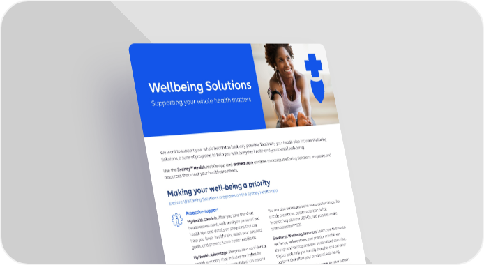 Proactive support MyHealth Check-in. After you take this short health assessment, we’ll send you personalized health tips and details on programs that can help you lower health risks, reach your personal goals, and prevent future health problems. MyHealth Advantage. We provide a confidential health summary that includes reminders for checkups, tests, and exams; lists of claims and prescriptions; and general health tips. 24/7 NurseLine. Talk to a trained, registered nurse over the phone and quickly get answers to common health concerns. Mental health resources Behavioral Health Advantage (BHA). If you’re trying to manage a behavioral health condition or substance use disorder, our behavioral health case managers are licensed mental health professionals who can help. They offer caring support for you and your family, including 24/7 drug and alcohol assistance. You can also access tools and resources for things like suicide prevention, autism, attention deficit hyperactivity disorder (ADHD), and post-traumatic stress disorder (PTSD). Emotional Wellbeing Resources. Learn how to develop resilience, reduce stress, and practice mindfulness through online programs and personalized coaching. Digital tools help you identify thoughts and behavior patterns that affect your emotional well-being. Autism Spectrum Disorder Program. Receive support for a covered family member with an autism spectrum disorder. Our licensed behavior analysts can help you navigate the healthcare system and will work with the whole family to help you understand services and access care. We want to support your whole health the best way possible. That’s why your health plan includes Wellbeing Solutions, a suite of programs to help you with everyday health and your overall well-being. Making your well-being a priority Explore Wellbeing Solutions programs on the Sydney Health app Wellbeing Solutions Supporting your whole health matters U e h t e s S y e n d y S MH h tl a e d n a p p a e li b o m a m o c. m e h t n s n o it u l o S g nie b ll e W s s e c c a o t e m it y n a d n a s m a r g o r p r .s d e e n e r a c h tl a e h r u o y t e e m t a h t s e c r u o s e