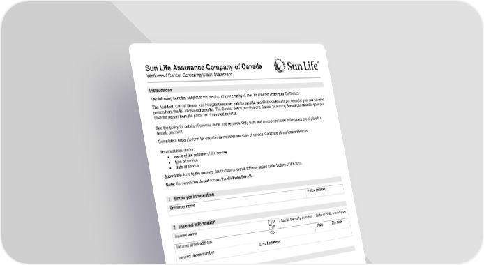 GCIFM-7261 Wellness Benefit Reimbursement 1 of 4 04/23 Sun Life Assurance Company of Canada Wellness / Cancer Screening Claim Statement I nstructions The following benefits, subject to the election of your employer, may be covered under your Certificate. The Accident, Critical Illness, and Hospital Indemnity policies provide one Wellness Benefit per calendar year per covered person from the list of covered benefits. The Cancer policy provides one Cancer Screening Benefit per calendar year per covered person from the policy list of covered benefits. See the policy for details of covered items and services. Only tests and procedures listed in the policy are eligible for benefit payment. Complete a separate form for each family member and date of service. Complete all applicable sections. You must include the: • name of the provider of the service • type of service • date of service Submit this form to the address, fax number or e-mail address stated at the bottom of this form. Note: Some policies do not contain the Wellness Benefit. 1 | Employer infor m ation Employer name Policy number 2 | Insured information Insured name M F Social Security number Date of birth (mm/dd/yyyy) Insured street address City State Zip code Insured phone number E-mail address 3 | Claimant information Claiming benefits for: Insured Spouse Dependent child Check all the coverages in place for the insured on the service date of the screening: Accident policy Critical Illness policy Cancer policy Hospital Indemnity policy Claimant name M F Social Security number Date of birth (mm/dd/yyyy) Provider name Provider phone number Date of service (mm/dd/yyyy) Provider street address City State Zip code Claimant home phone number Claimant work phone number