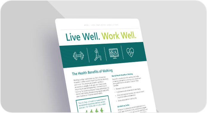 APRIL 2024 EMPLOYEE NEWSLETTER Live Well. Work Well. The Health Benefits of Walking Walking is often overlooked as a form of exercise; Mental Health Benefits of Walking however, it offers several health benefits for the body Beyond its physical benefits, walking also holds and mind. This simple yet powerful activity is immense potential for nurturing one’s mental well- accessible to people of all ages and fitness levels, being and emotional balance. Consider these requiring no special equipment, memberships or benefits: training. By boosting physical fitness and enhancing • Reduced stress and anxiety mental well-being, incorporating regular walks into your routine can improve overall health. • Improved mood and emotional well-being The U.S. Dept. of Health & Human Services • Enhanced cognitive function and reduced risk of recommends moderate-intensity aerobic cognitive decline and dementia exercise – for 150 to 300 minutes a week. • Better sleep patterns and quality Get Walking Today Whether it’s a leisurely stroll through nature or a brisk walk around the block, incorporating regular walks into your routine can improve both body and Physical Health Benefits of Walking mind. Walking for 30 minutes at least five days a Walking is a natural, low-impact form of exercise that week is a great way to improve or maintain your can yield notable improvements in physical fitness. overall health and well-being. Simply putting one foot in front of the other can While brisk walking is safe for most people, it’s still unlock a myriad of benefits for your body, including: important to talk to your doctor before you start an • Increased cardiovascular health (e.g., lower blood exercise program. pressure and cholesterol levels) • Improved respiratory health • Strengthened muscles and joints • Boosted immune function • Weight management support • Reduced risk of developing conditions such as heart disease, Type 2 diabetes, osteoporosis and some cancers