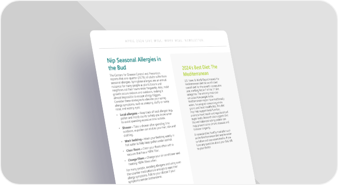 APRIL 2024 LIVE WELL. WORK WELL. NEWSLETTER: Nip Seasonal Allergies in the Bud 2024’s Best Diet: The The Centers for Disease Control and Prevention Mediterranean reports that one-quarter (25.7%) of adults suffer from seasonal allergies. Springtime allergies are an annual U.S. News & World Report named the nuisance for many people as plants bloom and Mediterranean diet the world’s best neighbors cut their lawns more frequently. Also, mold overall diet for the seventh consecutive growth occurs indoors and outdoors, making it year, ranking first in 7 of the 11 diet almost impossible to escape allergy triggers. categories. The winning meal plan Consider these strategies to alleviate your spring emulates how people in the allergy symptoms, such as sneezing, stuffy or runny Mediterranean region have traditionally nose, and watery eyes: eaten, focusing on consuming whole • Local allergens – Keep track of local allergen (e.g., grains and heart-healthy fats. This diet pollen and mold) counts to help you know when may help support brain function, to avoid spending excessive time outside. promote heart health and regulate blood • Shower – Take a shower after spending time sugar levels. Research also suggests that outdoors, as pollen can stick to your hair, skin and this well-balanced eating pattern can clothing. help prevent some chronic diseases and • Wash bedding – Wash your bedding weekly in increase longevity. hot water to help keep pollen under control. A nonrestrictive, healthy meal plan such • Clean floors – Clean your floors often with a as the Mediterranean diet may be easier vacuum that has a HEPA filter. to follow and stay committed to. If you have any questions about your diet, talk • Change filters – Change your air conditioner and to your doctor. heating HEPA filters often. For many people, avoiding allergens and using over- the-counter medications is enough to ease their allergy symptoms. Talk to your doctor if your symptoms remain bothersome.