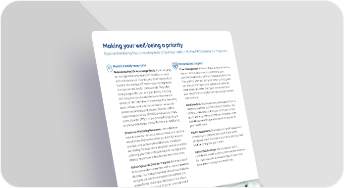 Mental health resourcess Personalized support Case Management. After an illness or hospitalization, you can receive one-on-one support and care coordination from our team of medical professionals. They partner with you and your family to help guide you through the healthcare system and make the most of your benefits. Their goal is to understand your needs from all angles and help you get the best care possible. ConditionCare. Receive personalized support from a healthcare professional for a chronic condition, like asthma or diabetes, to help you reach your health goals. We may call you to find out if ConditionCare could help you manage your condition and reach your health goals. Health Assessment. Complete your health assessment to receive your personalized report. Know what’s going well and if there are any at-risk areas you could work on to improve your health. MyHealth Advantage. We provide you with a confidential health summary that includes reminders for checkups, tests, and exams; lists of claims and prescriptions; and general health tips. Making your well-being a priority Explore Wellbeing Solutions programs at Sydney Health > My Health Dashboard > Programs B .) A H B ( e g a t n a v d A h tl a e H l a r o iv a h e g n iy rt e r’u o y fI t e p o c r o n o iti d n o c h tl a e h l a r o iv a h e b a e g a n a m o w e c a f o t e v a h t’n o d u o y ,r e d r o si d e s u e c n a ts b u s h ti i e r a sr e g a n a m e s a c h tl a e h l a r o iv a h e b r u O .e n o l a t l r e ff o y e h T .sl a n o is s e f o r p h tl a e h l a t n e m d e s n e ci c g n i d u lc n i ,yli m a f r u o y d n a u o y r o f tr o p p u s g n ir a 2 r u o y e v o r p m i o t ,e c n a tsis s a l o h o cl a d n a g u r d 7 / 4 q g n ir u t a e f ,b u h e g d e l w o n k r u o o t n i p a T .e fil f o y til a u t e d ici u s e kil s ci p o t n o sr a n i b e w d n a ,s e lcitr a ,sl o o a ticif e d n o it n e tt a , m sit u a ,tr o p p u s d n a s s e n e r a w h cit a m u a rt-ts o p d n a ,) D H D A ( r e d r o si d y tivit c a r e p y s u o y e d i u g p l e h o t e r e h e r’e W .) D S T P ( r e d r o si d s s e rt o .g n ie b -ll e w d n a h tl a e h l a t n e m r e tt e b o t h t a p e h t n E .s e c r u o s e R g n i e b ll e W l a n o it o m e vit c e ff e n r a e L w e cit c a r p d n a ,s s e rts e c u d e r ,e c n eilis e r p o l e v e d o t s y a m st h g u o h t yfit n e d i u o y p l e h sl o o t l a ti g i D .s s e n l u f d n i a l a n o it o m e r u o y t c e ff a t a h t s n r e tt a p r o iv a h e b d n w .g n ie b -ll e T d e zil a n o sr e p d n a s m a r g o r p e nil n o h g u o r h c ,s s e rts e g a n a m o t s y a w e vit c e ff e n r a e l ll’u o y ,g nih c a o a .s e u s si p e e ls d n a ,e s u e c n a ts b u s ,n o is s e r p e d ,y t eix n A . m a r g o r P r e d r o si D m u rt c e p S m sit u tr o p p u s e vie c e R f m u rt c e p s m sit u a n a h ti w r e b m e m yli m a f d e r e v o c a r o d u o y p l e h n a c sts yl a n a r o iv a h e b d e s n e cil r u O .r e d r o si n y n a s s e r d d a d n a m e ts y s e r a c h tl a e h e h t e t a g iv a u e l o h w e h t n o s u c o f e W .s e g n e ll a h c yli m a f e u q in f d n a d n a tsr e d n u o t u o y f o ll a h ti w k r o w d n a yli m a a .e r a c e l b a li a v a s s e c c
