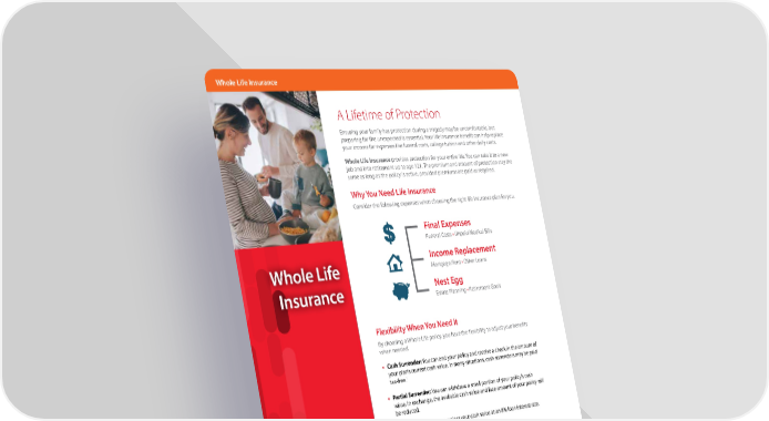 Whole Life Insurance A Lifetime of Protection Ensuring your family has protection during a tragedy may be uncomfortable, but preparing for the unexpected is essential. Your life insurance benefit can help replace your income for expenses like funeral costs, college tuition and other daily costs. Whole Life Insurance provides protection for your entire life. You can take it to a new job and into retirement up to age 121. The premium and amount of protection stay the same as long as the policy is active, provided premiums are paid as required. Why You Need Life Insurance Consider the following expenses when choosing the right life insurance plan for you. Final Expenses Funeral Costs • Unpaid Medical Bills Income Replacement Whole Life Mortgage/Rent • Other Loans Insurance Nest Egg Estate Planning • Retirement Goals Flexibility When You Need It By choosing a Whole Life policy, you have the flexibility to adjust your benefits when needed. • Cash Surrender: You can end your policy and receive a check in the amount of your plan’s current cash value. In many situations, cash surrenders may be paid 1 tax-free. • Partial Surrender: You can withdraw a small portion of your policy’s cash value. In exchange, the available cash value and face amount of your policy will be reduced. • Loans: You can borrow against your cash value at an 8% loan interest rate. Discontinue Your Premium While Keeping Your Coverage Active • Same Amount of Coverage - Shorter Length of Time: Under the Extended Term Insurance provision, your policy’s original face amount (minus outstanding loans or accelerated benefit payments) will only be guaranteed for a specific term of time. In addition, your premium is “paid in full” until your new extended term period expires, terminating your policy. • Coverage to Age 121 - Smaller Guaranteed Benefit Amount: The Reduced Paid-Up Provision will reduce your original death benefit to a smaller amount. You will have lifetime coverage at a reduced benefit with no premiums. Your cash value will continue to accumulate. 1 As long as the cash surrender does not exceed the total premiums received under the policy since inception. Please consult your tax consultant for your specific situation.