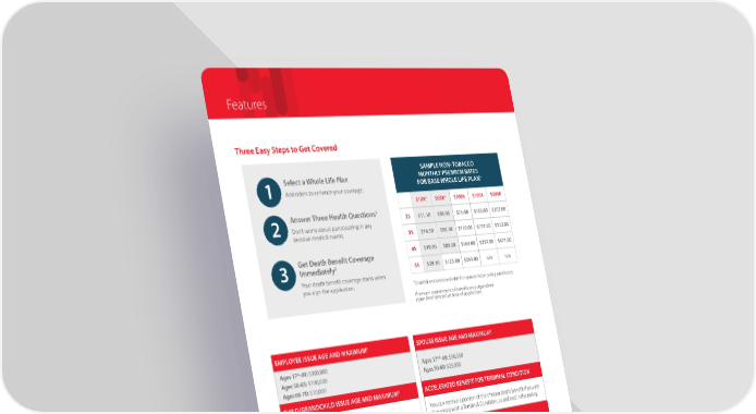 Features EMPLOYEE ISSUE AGE AND MAXIMUM5 SPOUSE ISSUE AGE AND MAXIMUM5 Ages 17*-49: $300,000 Ages 50-65: $100,000 Ages 66-70: $10,000 Ages 17**-49: $50,000 Ages 50-60: $25,000 CHILD/GRANDCHILD ISSUE AGE AND MAXIMUM5 ACCELERATED BENEFIT FOR TERMINAL CONDITION Ages 1 month - 26: (14 in MA, WA; 17 in MI, PA) $50,000 ($15,000 in WA) You can receive a portion of the chosen death benefit if you are diagnosed with a Terminal Condition, as defined in the policy. RATES BASED ON ISSUE AGE AND TOBACCO STATUS LEVEL PREMIUM AND DEATH BENEFIT6 Your premiums will be based on your age on the date your policy becomes effective. You may be eligible for reduced rates if you are a non-tobacco user. Premiums and the death benefit are guaranteed to remain level for the life of the policy to age 121. Death benefits are generally paid tax free7. Three Easy Steps to Get Covered Answer Three Health Questions2 Don’t worry about participating in any invasive medical exams. 2 Select a Whole Life Plan Add riders to enhance your coverage. 1 Get Death Benefit Coverage Immediately3 Your death benefit coverage starts when you sign the application. 3 2Issuance of the policy may depend on the answer to these questions. 3Interim coverage for death will be in force from the date your application is signed if, on such date, the proposed insured is insurable per our underwriting guidelines for the requested coverage per the terms of the policy. This interim coverage for death will remain in force until the earlier of 1) the date a policy becomes effective, 2) the date we decline the application, or 3) the date we notify the proposed insured that they are ineligible for interim coverage. The employee and/or spouse must remain actively at work during the interim coverage period. If the death of the proposed insured occurs during the interim coverage period, the first month’s premium will be subtracted from the policy proceeds. Interim coverage is only for death benefits under the base policy and Children’s Term Rider. No interim coverage benefits are available under any Waiver of Premium Rider, Accidental Death and Dismemberment Rider, Accelerated Benefit Rider for Long Term Illness or Accelerated Benefit for Critical Illness Rider. 4Example is based on monthly non-tobacco rates for a WL14 base plan only. Contact your American Fidelity account manager for specific ages, rates or face amounts. 5Face amounts vary based on issue age. Issuance of coverage may be subject to responses received to a few medical questions. 6Provided no partial surrenders or accelerated benefits are taken. 7Please consult your tax advisor for your specific situation. *In the states of AK, AR, CO, IA, KS, MN, MO, NH, OR, PA, RI, SC, TN and WI, the minimum issue age for younger employees is 18. **In the states of MO and PA, the minimum issue age for younger spouses is 18. SAMPLE NON- TOBACCO MONTHLY PREMIUM RATES FOR BASE WHOLE LIFE PLAN4 $10K+ $50K+ $100K $150K $300K 25 $11.10 $39.00 $75.00 $105.00 $207.00 35 $14.50 $56.50 $110.00 $157.50 $312.00 45 $19.90 $83.50 $164.00 $237.00 $471.00 55 $29.10 $123.00 $243.00 n/a n/a +Shaded amounts available for spouse base policy purchases. Premium and amount of benefits vary dependent upon level selected at time of application.