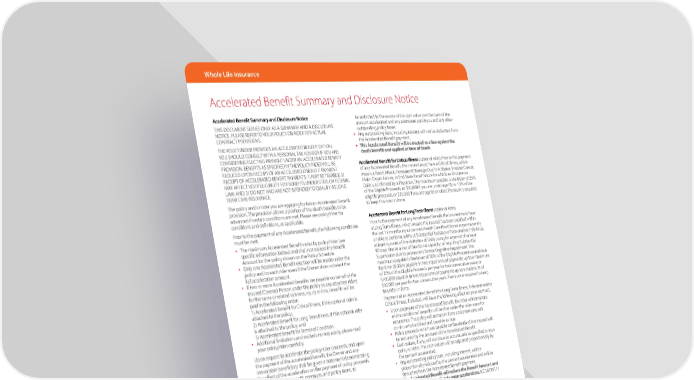 Accelerated Benefit Summary and Disclosure Notice THIS DOCUMENT SERVES ONLY AS A SUMMARY AND A DISCLOSURE NOTICE. PLEASE REFER TO YOUR POLICY OR RIDER FOR ACTUAL CONTRACT PROVISIONS. THE POLICY/RIDER PROVIDES AN ACCELERATED BENEFIT OPTION. YOU SHOULD CONSULT WITH A PERSONAL TAX ADVISOR IF YOU ARE CONSIDERING ELECTING PAYMENT UNDER AN ACCELERATED BENEFIT PROVISION. BENEFITS AS SPECIFIED IN THE POLICY/RIDER WILL BE REDUCED UPON RECEIPT OF AN ACCELERATED BENEFIT PAYMENT. RECEIPT OF ACCELERATED BENEFIT PAYMENTS: 1) MAY BE TAXABLE; 2) MAY AFFECT YOUR ELIGIBILITY FOR BENEFITS UNDER STATE OR FEDERAL LAW; AND, 3) DO NOT AND ARE NOT INTENDED TO QUALIFY AS LONG- TERM CARE INSURANCE. The policy and/or rider you are applying for has an Accelerated Benefit provision. The provision allows a portion of the death benefits to be advanced if certain conditions are met. Please see policy/rider for conditions and definitions, as applicable. Prior to the payment of any Accelerated Benefit, the following conditions must be met: • The maximum Accelerated Benefit varies by policy/rider (see specific information below) and shall not exceed the Benefit Amount for the policy shown on the Policy Schedule. • Only one Accelerated Benefit election will be made under the policy and/or each rider even if the Owner does not elect the full acceleration amount. • If two or more Accelerated Benefits are payable on behalf of the Insured/Covered Person under the policy or any attached riders for the same or related sickness, injury or loss, benefits will be paid in the following order: 1) Accelerated Benefit for Critical Illness, if this optional rider is attached to the policy; 2) Accelerated Benefit for Long Term Illness, if this optional rider is attached to the policy; and 3) Accelerated Benefit for Terminal Condition. • Additional limitations and exclusions may apply, please read your policy/rider carefully. Upon request to accelerate the policy/rider proceeds, and upon the payment of the accelerated benefit, the Owner and any irrevocable beneficiary shall be given a statement demonstrating the effect of the acceleration on the payment of policy proceeds, cash value, death benefit, premium, and policy loans, as applicable. Accelerated Benefit for Terminal Condition Prior to the payment of any Accelerated Benefit, the Insured/Covered Person must have a Terminal Condition, defined as an imminent death expected as a result of a non-correctable medical condition that with reasonable medical certainty will result in a drastically limited life span of the Insured/Covered Person of 12 months or less. The maximum payable is the lesser of: 50% of the eligible proceeds as defined in the policy/rider, or $100,000. There is no premium associated with this provision. Payment of an Accelerated Benefit, if elected, will have the following effect on your contract: • Upon payment of the Accelerated Benefit, the policy/rider will remain in force. Any premiums due to keep the policy/rider in force will be paid by us, and will be deducted from the policy proceeds upon death, unless you are currently exercising the Automatic Premium Loan option. If you are currently exercising the Automatic Premium Loan option, any premiums will continue to be paid under this option, until such time as this option is exhausted or discontinued. • Policy proceeds which are payable on the death of the Insured/Covered Person will be reduced by the amount of the Accelerated Benefit, any outstanding policy loans, and any premiums paid by us on your behalf. • Cash values, if any, will continue to accumulate as specified in your policy or rider. Access to the policy cash value may be restricted to the excess of the cash value over the sum of the amount accelerated and any premiums paid by us and any other outstanding policy loans. • Any outstanding loan, including interest will not be deducted from the Accelerated Benefit payment. • This Accelerated Benefit will be treated as a lien against the death benefit and applied at time of death. Accelerated Benefit for Critical Illness (optional rider) Prior to the payment of any Accelerated Benefit, the Insured must have a Critical Illness, which means a Heart Attack, Permanent Damage Due To A Stroke, Invasive Cancer, Major Organ Failure, or End State Renal Failure for which an Occurrence Date is confirmed by a Physician. The maximum payable is the lesser of 25% of the Eligible Proceeds, or $50,000 if you are under age 65; or 15% of the eligible proceeds, or $25,000 if you are age 65 or older. Premium is required to keep this rider in force. Accelerated Benefit for Long Term Illness (optional rider) Prior to the payment of any Accelerated Benefit, the Insured must have a Long Term Illness, which means the Insured has been certified within the last 12 months by a Licensed Health Care Practitioner as permanently unable to perform, without Substantial Assistance from another individual, at least two out of five Activities of Daily Living for a period of at least 90 days due to a loss of functional capacity; or requiring Substantial Supervision due to permanent Severe Cognitive Impairment. The maximum payable is the lesser of 50% of the Eligible Proceeds available at the time of claim payable in two equal annual payments up to a maximum of 25% of the Eligible Proceeds per year for two consecutive years; or $100,000 payable in two equal annual payments up to a maximum of $50,000 per year for two consecutive years. Premium is required to keep this rider in force. Payment of an Accelerated Benefit for Long Term Illness, if elected and/or Critical Illness, if elected, will have the following effect on your contract: • Upon payment of the Accelerated Benefit, the rider will terminate and no additional benefits will be due under the rider, even for recurrence. The policy will remain in force and premiums will continue to be billed and payable as due. • Policy proceeds which are payable on the death of the Insur