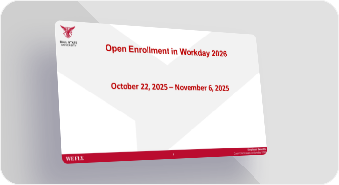 Employee Benefits Open Enrollment in Workday 2026 This screen will show you all of the benefits offered to you by Ball State University. This screen is where you can make changes to your benefits for 2026. To make a change or view the benefit and the cost associated with different plans simply click Manage or Enroll under each benefit. 6 Enroll in Benefits