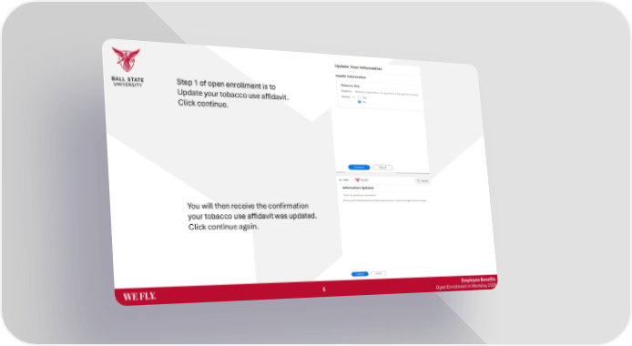 Employee Benefits Open Enrollment in Workday 2026 Step 1 of open enrollment is to Update your tobacco use affidavit. Click continue. You will then receive the confirmation your tobacco use affidavit was updated. Click continue again. 5