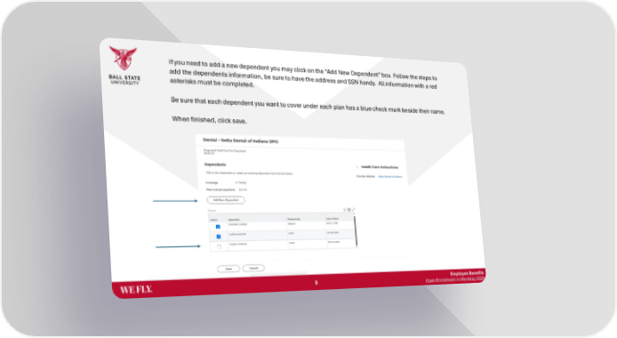 Employee Benefits Open Enrollment in Workday 2026 If you need to add a new dependent you may click on the “Add New Dependent” box. Follow the steps to add the dependents information, be sure to have the address and SSN handy. All information with a red asterisks must be completed. Be sure that each dependent you want to cover under each plan has a blue check mark beside their name. When finished, click save. 8
