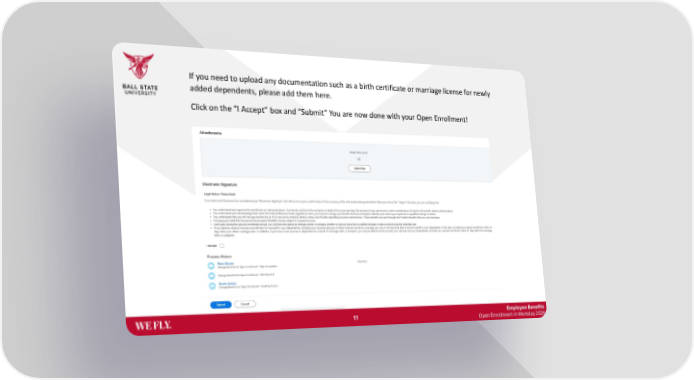 Employee Benefits Open Enrollment in Workday 2026 If you need to upload any documentation such as a birth certificate or marriage license for newly added dependents, please add them here. Click on the “I Accept” box and “Submit” You are now done with your Open Enrollment! 11
