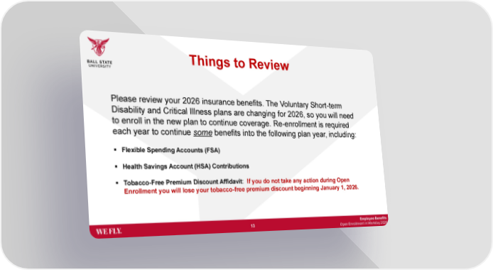 Employee Benefits Open Enrollment in Workday 2026 Things to Review Please review your 2026 insurance benefits. The Voluntary Short-term Disability and Critical Illness plans are changing for 2026, so you will need to enroll in the new plan to continue coverage. Re-enrollment is required each year to continue some benefits into the following plan year, including: ▪ Flexible Spending Accounts (FSA) ▪ Health Savings Account (HSA) Contributions ▪ Tobacco-Free Premium Discount Affidavit: If you do not take any action during Open Enrollment you will lose your tobacco-free premium discount beginning January 1, 2026. 13
