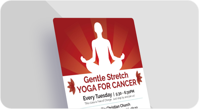 Yoga Cancer Patients No CostAn informative flyer for free weekly yoga sessions aimed at supporting those affected by cancer, highlighting benefits such as stress reduction and improved physical functions. Page 1