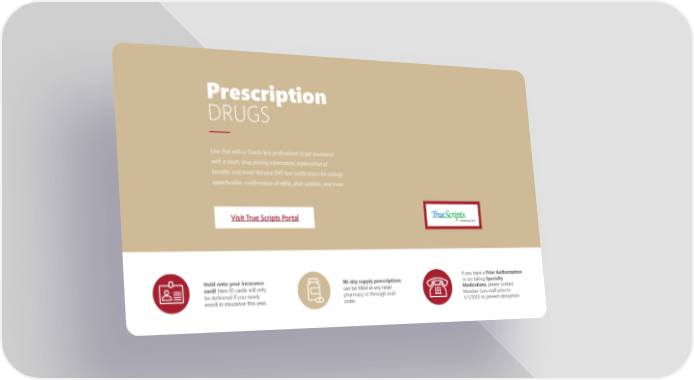 Prescription DRUGS Live chat with a TrueScripts professional to get assistance with a claim, drug pricing information, explanation of benefits, and more! Receive SMS text notifications for savings opportunities, confirmation of refills, plan updates, and more. Visit True Scripts Portal Hold onto your insurance 90-day supply prescriptions If you have a Prior Authorization card! New ID cards will only can be filled at any retail or are taking Specialty be delivered if you newly pharmacy or through mail Medications, please contact enroll in insurance this year. order. Member Care staff prior to 1/1/2025 to prevent disruption!