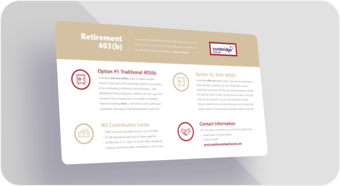 Retirement You may contribute tax-deferred income to 403(b) retirement accounts with 403(b) Corebridge Financial. Funds grow with potentially greater accumulation as tax withholding is deferred until distribution. Open an Account Option #1: Traditional 403(b) Option #2: Roth 403(b) Contribute pre-tax dollars today to reduce taxable Contribute after-tax dollars today. Take tax-free distributions income. Funds grow with potentially greater accumulation if the following conditions are met: Distribution must be as tax withholding is deferred until distribution. Take made after the end of the five-year period beginning with the distributions if the following conditions are met: Age 59½; first year for which a Roth contribution was made to the plan, Severance from employment; Your death or disability; and you turn age 59½, or your total disability or death. Financial hardship Note: a 10% federal early withdrawal Reduce taxable income during retirement, and possibly help tax penalty may apply to withdrawals prior to age 59½. reduce taxation of Social Security benefits under current law. IRS Contribution Limits Contact Information • 100% of annual includible income up to $23,000 You can reach out directly to your financial professional. • $7,500 age-based catch-up for those aged 50+ • Jared Roush, Financial Advisor • $3,000 extra if 15+ years of service with a qualifying • (260) 415-9498 employer and have under-contributed in prior years • jared.roush@corebridgefinancial.com