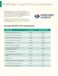 This document provides a price comparison of surgical procedures offered by WellBridge Surgical against the average market prices in Indianapolis.